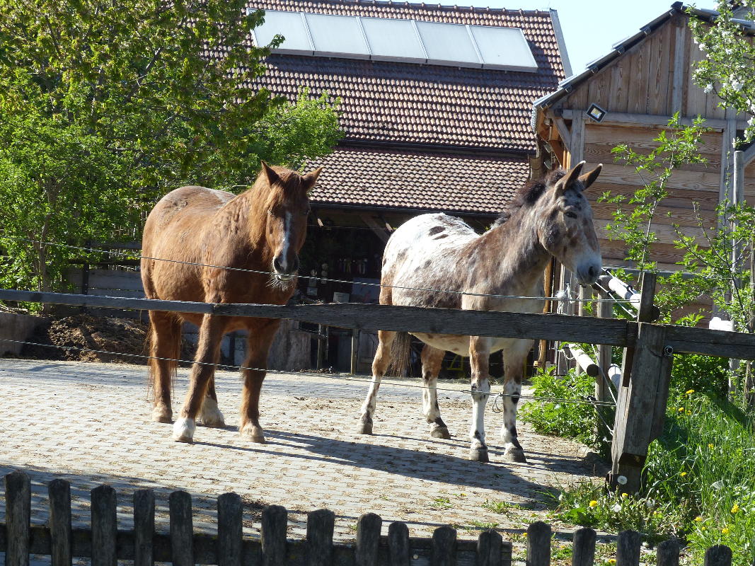 Am Ortseingang von Trugenhofen müssen wir einen Bio-Bauernhof durchqueren, der immer recht gruselig für unsere Pferde ist. Aus jedem Loch guckt ein Rindviech...