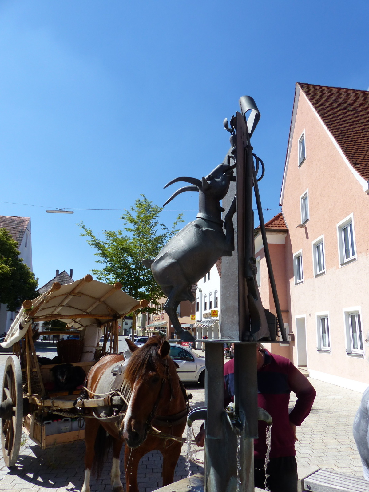 Es ist heiß, wir halten in Rennertshofen am Brunnen, um Rufus zu tränken. Er findet das "Hedderle" aber erst mal sehr verdächtig. Trotzdem, der Durst ist stärker als das Mißtrauen. (FILM)