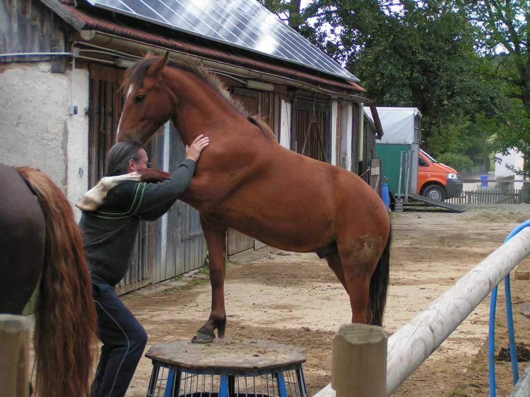 Sein Podest hatte er sofort wiedererkannt. Seit 2 Tagen übt Herrchen immer wieder. Das Problem ist nicht, auf das Podest zu steigen, sondern es nur auf Anweisung zu tun - und nicht wahlweise irgend welche anderen Objekte zu erklimmen! Inzwischen muß ich beim Misten aufpassen, daß Rufus mir nicht ständig in die Schubkarre klettert (heute morgen 2x...)