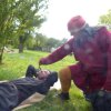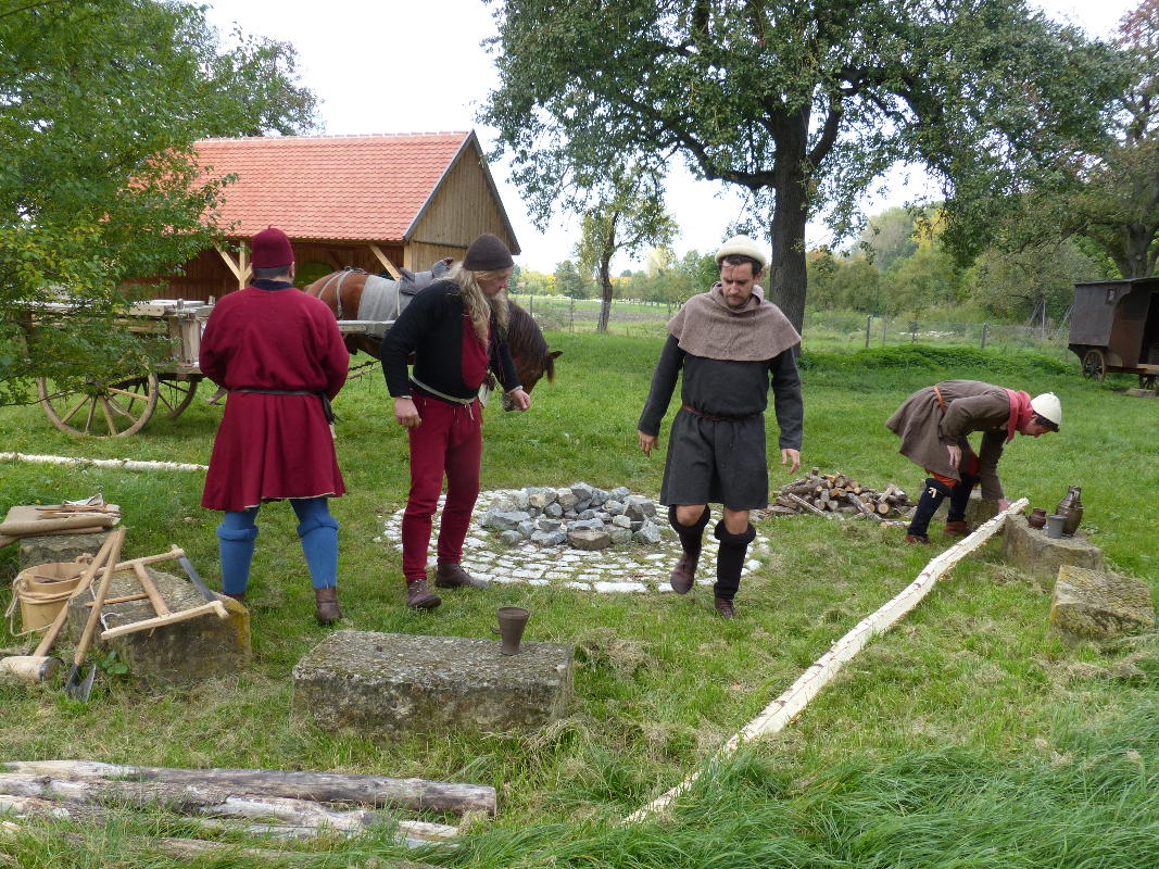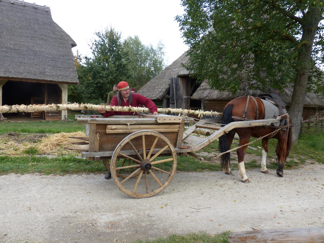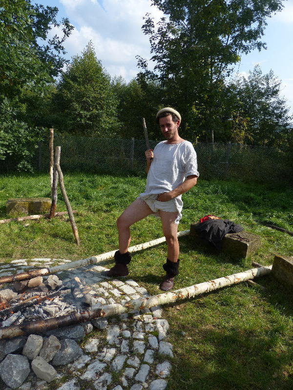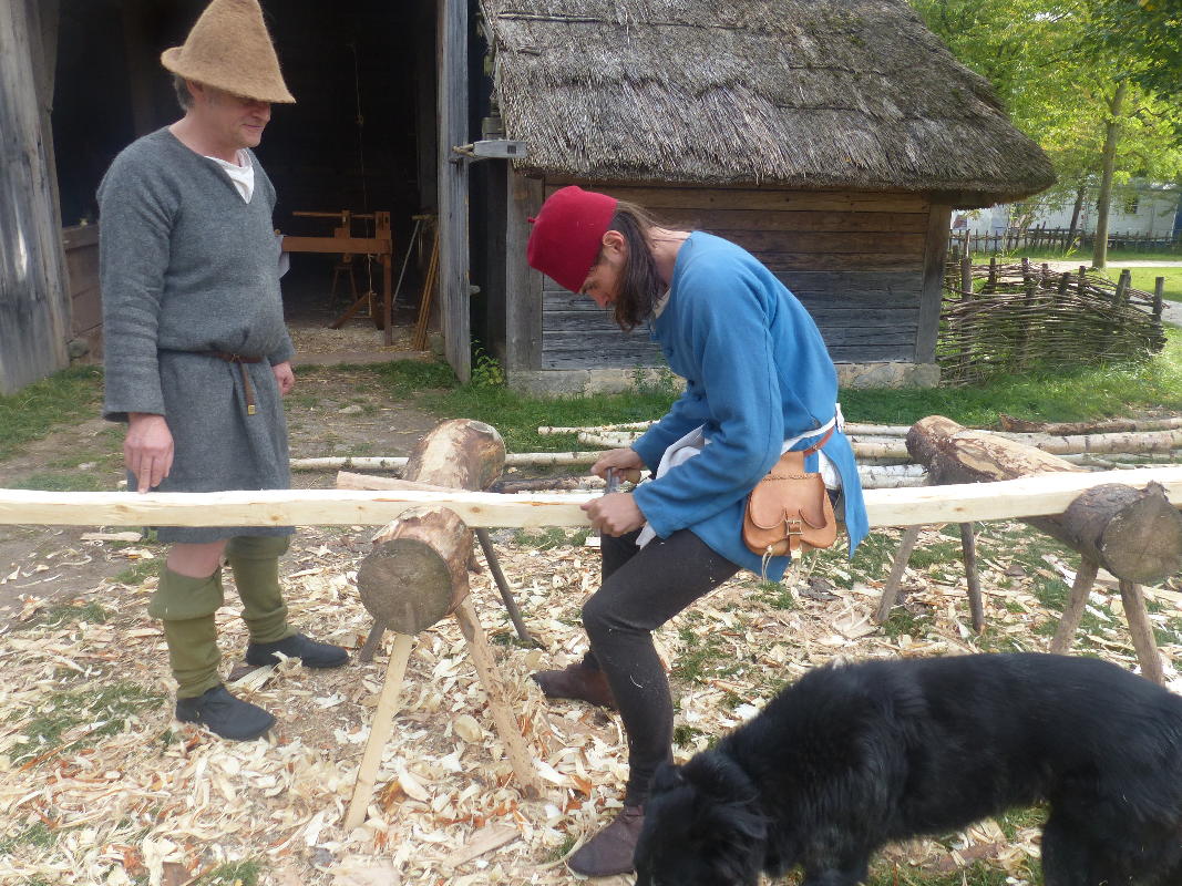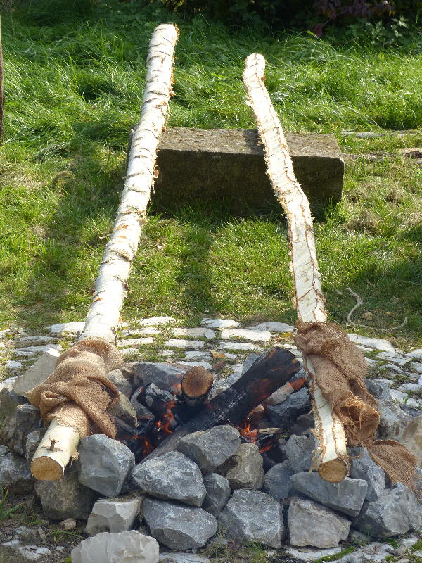 Als Vorarbeit haben wir im Wald bei Ammerfeld einige junge Birken gefällt. Aus diesen Birkenstämmen wird zunächst einmal die grobe Form heraus gehauen.