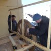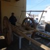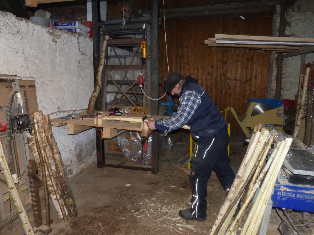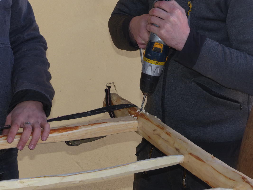 Unter dem kritischen Blick der Schmarhofbewohner und bei eisigen Temperaturen wird beim Wagenbau-Workshop im März 2018 auch der Korb des Wagens hergestellt, also eine Rahmenkonstruktion und seitliche Leitern. Später werden dann noch Bodenbretter aufgenagelt.