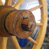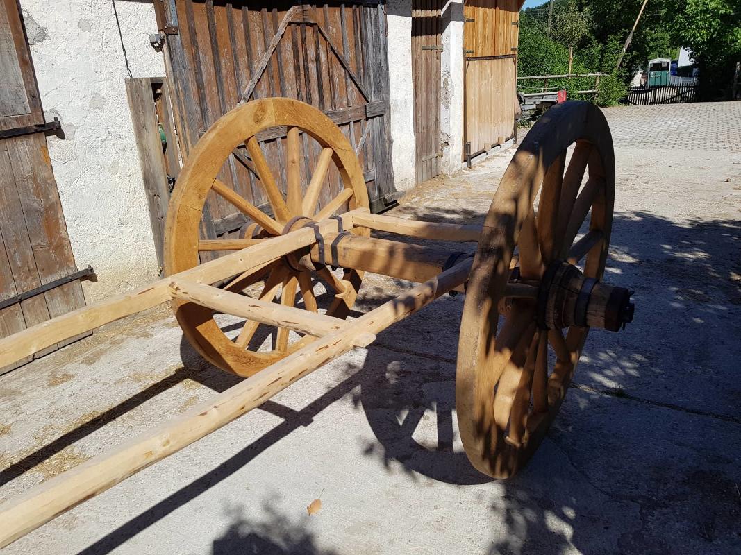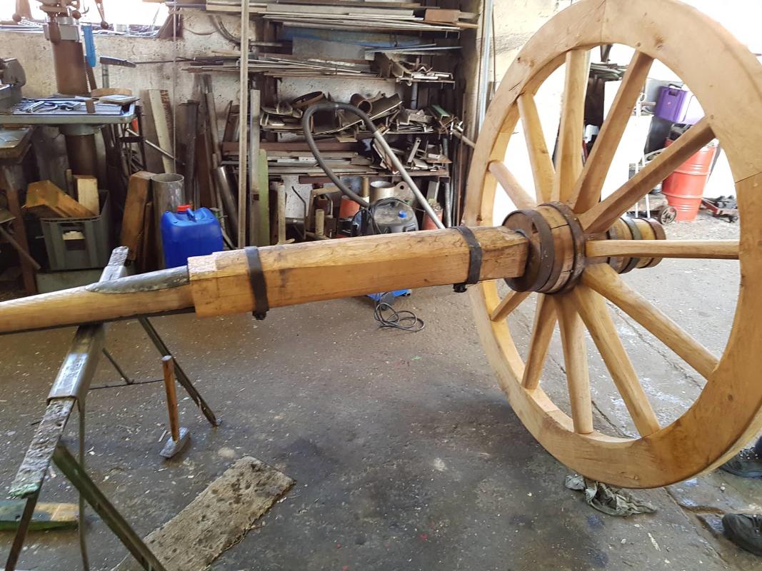 Der Karren ist jetzt im Rohbau fertig, Die Leitern stehen bereit, Achse und Gestell sind mit Metallschlössern fest miteinander verbunden, die Räder können auf die metallgeschützten Achsstümpfe aufgesteckt und mit einem Splint gesichert werden.