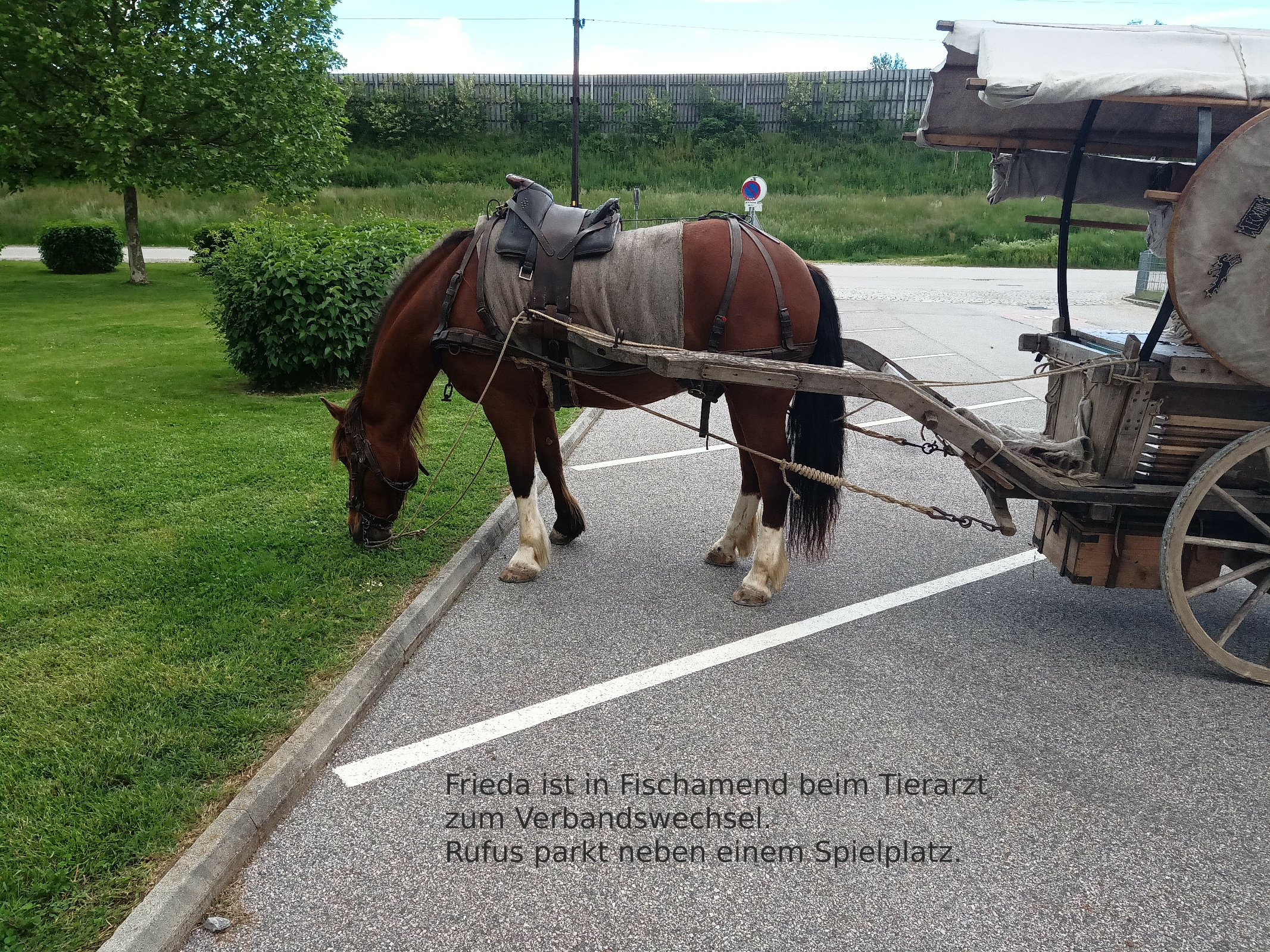 Während Frieda beim Tierarzt behandelt wird, parkt Bert das Pferd an einer Grünanlage beim Spielplatz - sofort sind alle Kinder da!