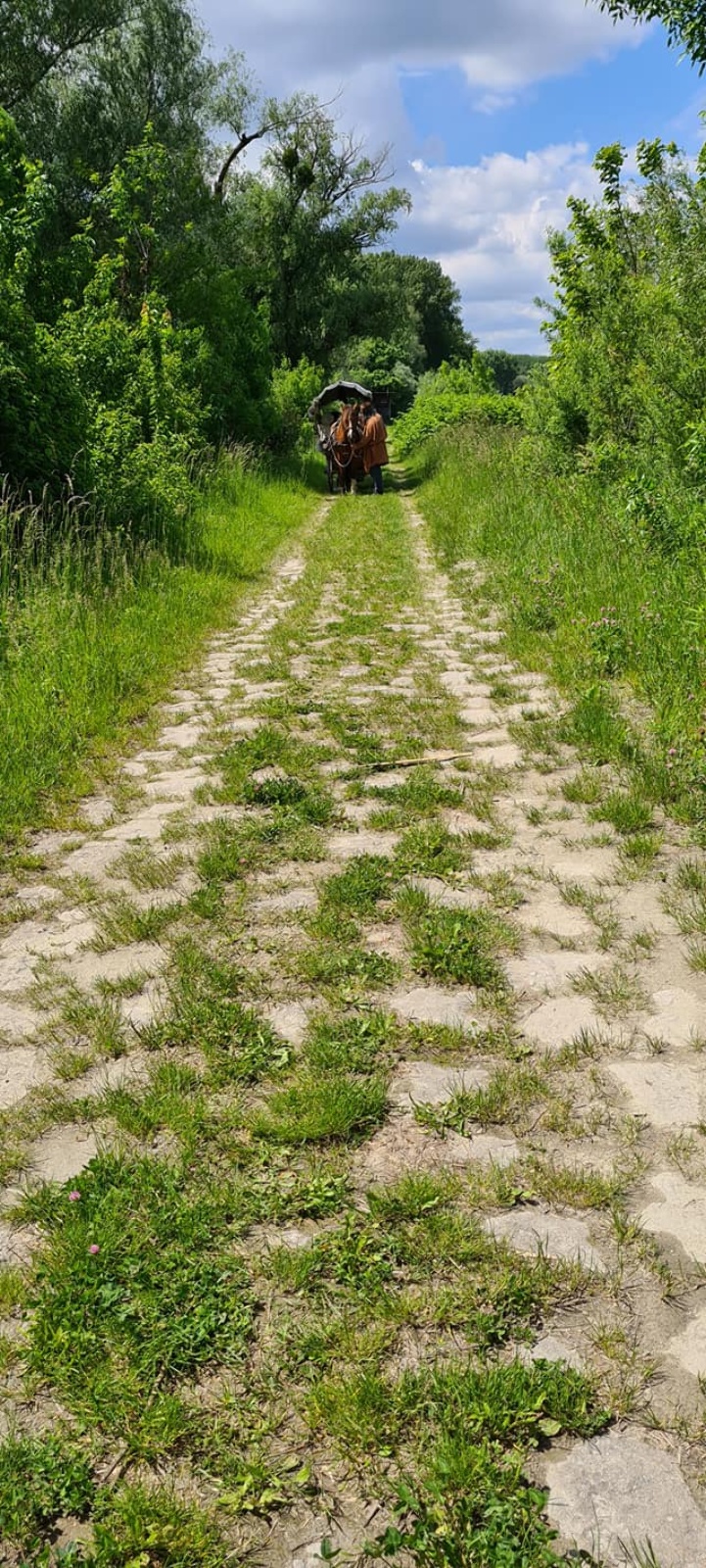 Im nächsten Ort, Regelsbrunn, treffen wir den slowakischen Geschichtsdarsteller Peter Hricak, der uns bis Carnuntum begleiten wird. Seine fröhliche Art gibt uns wieder Schwung zum Weitermarschieren. Besonders für Géza ist das gut, Peter lenkt ihn von seinem schmerzenden Fuß ab. Nur ich setze mich klammheimlich hinten in den Karren, denn die neuen Schuhe haben mir Blasen beschert. Irgend einen Vorteil muß es ja haben, die Frau des Fuhrmanns zu sein...