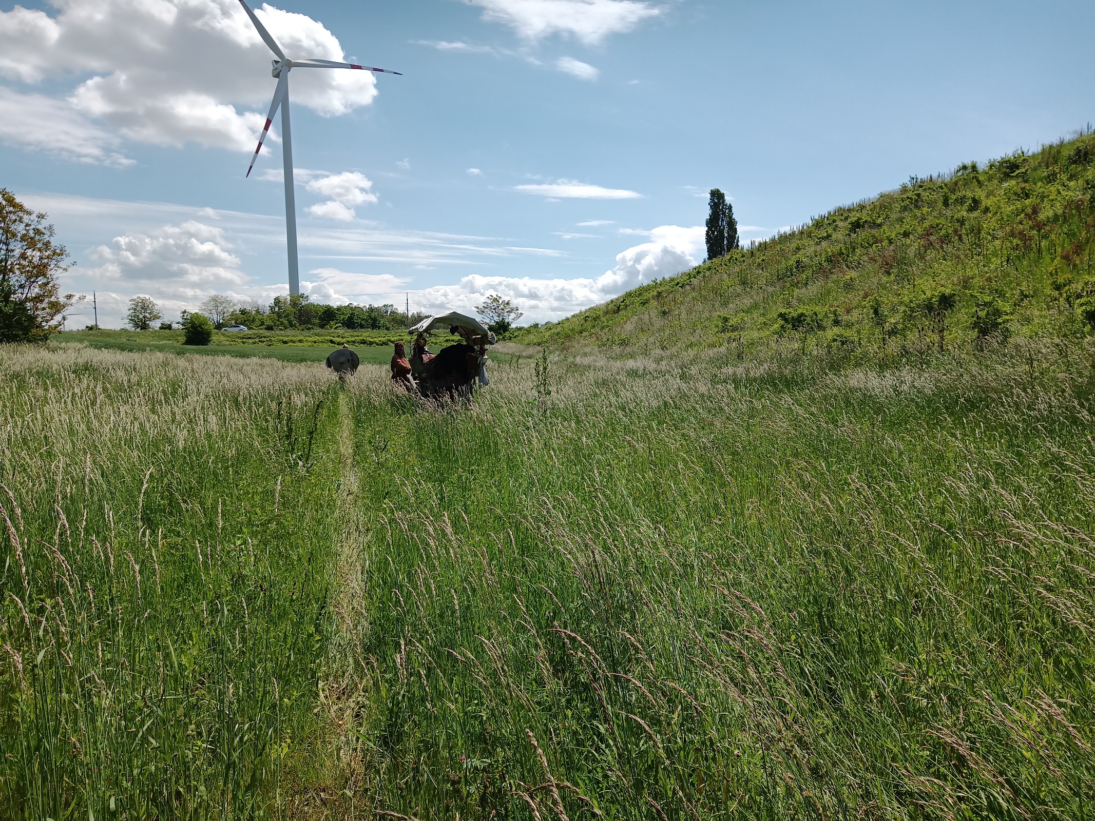Wir begegnen einem Ranger, der uns freundlich darauf hinweist, daß wir mit Pferd und Karren hier eigentlich nicht gehen dürfen - was insbesondere deswegen absurd ist, da wir uns hier auf dem extra so bezeichneten Treppelweg - also Treidelweg - befinden, der einmal speziell für Pferde zum Ziehen der Donaukähne angelegt worden war. Im Pflaster sieht man sogar die Gleisspuren der eisernen Karrenräder. Der Ranger, dem das alles natürlich auch bewußt ist, begleitet uns sogar ein Stück des Weges und zeigt uns auf der Karte, wo wir den Park wieder verlassen können. Eigentlich richten wir ja überhaupt keinen Schaden an, meint er. Mit einem Augenzwinkern schlägt er die "österreichische Lösung" vor: "Ich hab's euch gesagt und gehe jetzt weiter. Was ihr dann macht, ist eure Sache". Wir wollen aber tatsächlich bei Haslau weg von der Donau und hinaus auf die Felder.