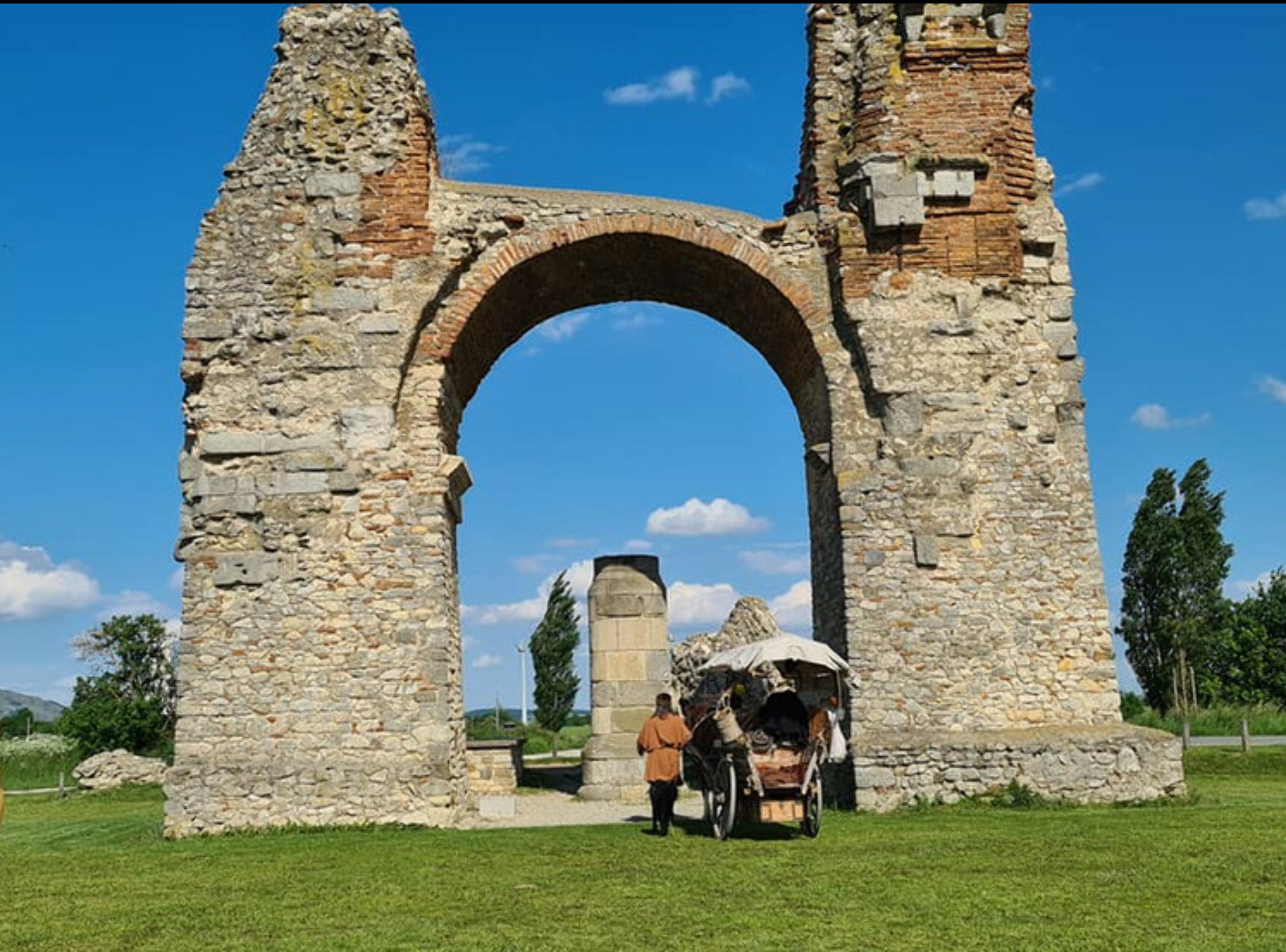 Von Weitem sehen wir schon das Heidentor in Carnuntum, der Triumphbogen, der sozusagen das Wahrzeichen der Stadt ist. (FILM 2:07)