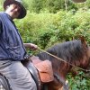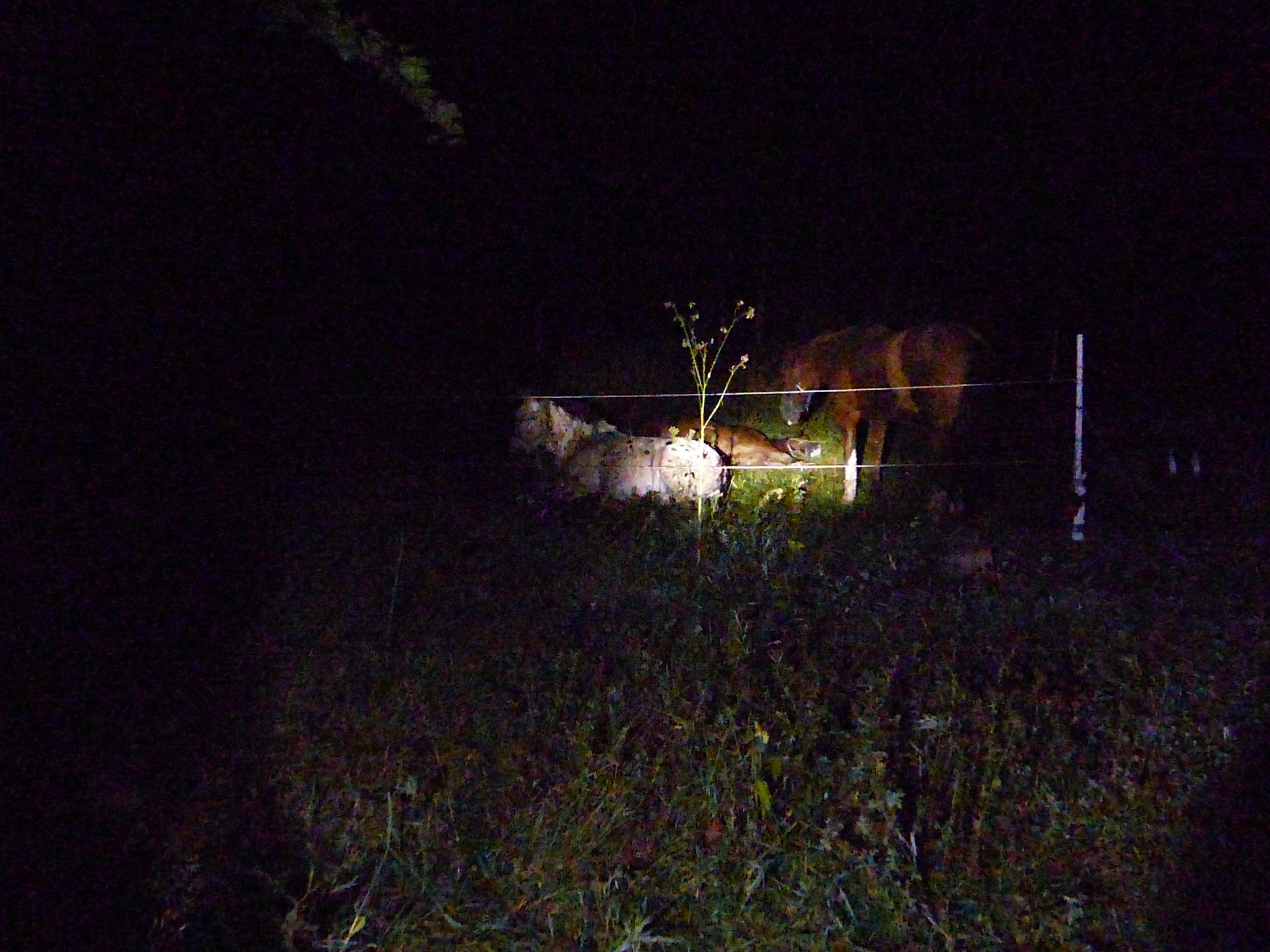 Wir hatten uns als Übernachtung eigentlich eine kleine Schutzhütte auserkoren, dort war aber extrem wenig Gras für die Pferde vorhanden. Ein kleines Stück vorher waren wir an einer Mini-Wiese vorbeigekommen, gleich im Anschluß an einen Rastplatz mit Tisch und Bänken. Wir kehren also um und errichten unser Lager auf einer leidlich ebenen Stelle am lichten Waldrand. Ein kleiner Seitenweg bietet außerdem eine enorme Regenpfütze, an der wir die Pferde bequem tränken können. Das Gras reicht aus, um ein wenig Heu zu sparen. Wir verbringen alle miteinander eine gemütliche und erholsame Nacht.