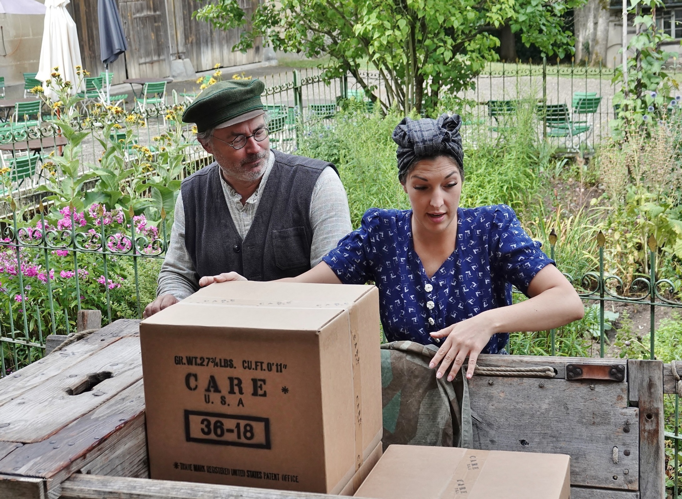 Endlich sind einige der versprochenen CARE-Pakete aus Schwäbisch Hall eingetroffen - natürlich viel weniger als angekündigt. Die Haushalte stellen sich mit ihren Bezugsscheinen vor dem Postamt an und mit etwas Glück erhalten sie eines der begehrten Pakete mit Milchpulver, Eipulver, Obstkonserven, Corned Beef, Schokolade, Zucker, usw. Die Hausfrauen sind teilweise ratlos, was sich genau in den Verpackungen befindet und wie man es einsetzt...