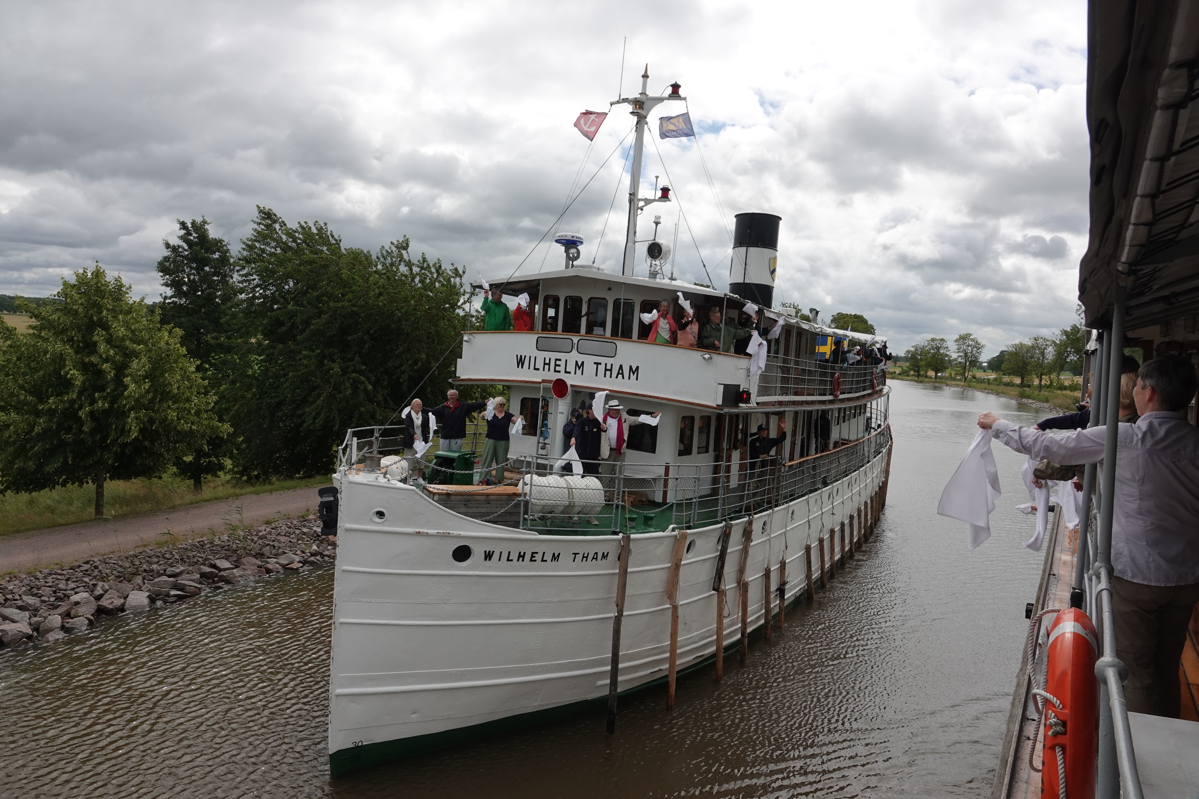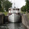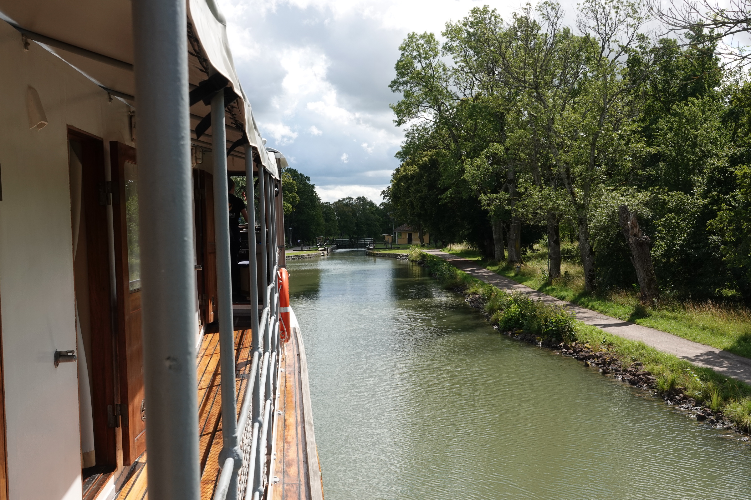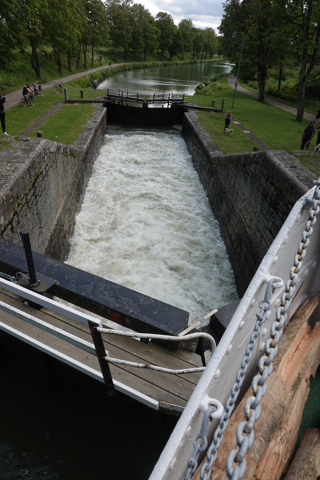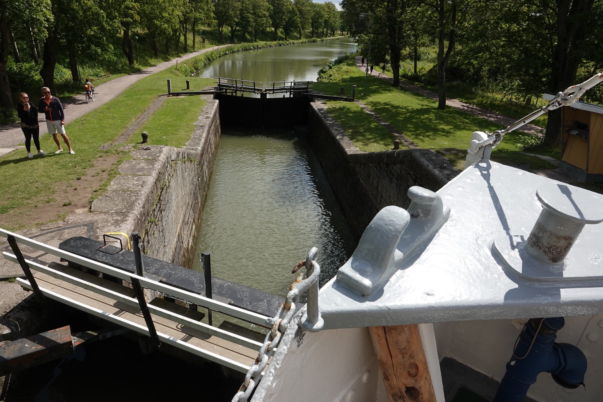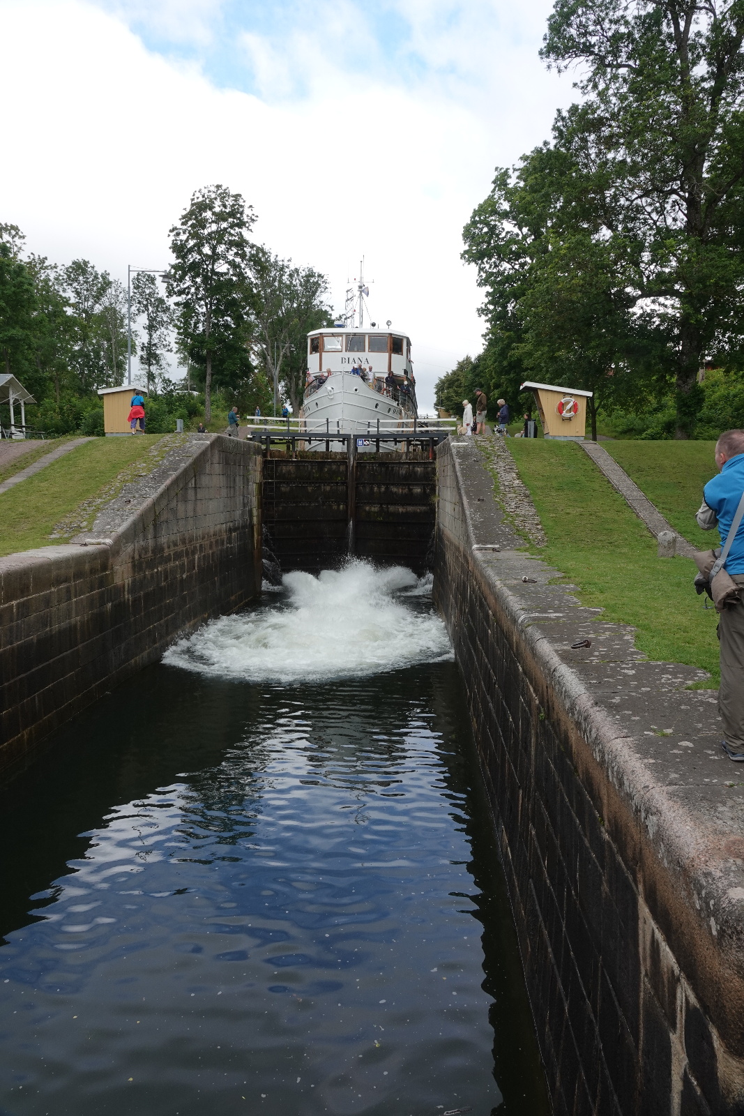 Nach der Klosterbesichtigung kehren wir zum nahe gelegenen Göta Kanal zurück, wo unser Kanalschiff in der Zwischenzeit das Schleusensystem von Berg (15 Schleusen) 40 m hinunter zum See Roxen durchläuft. Wir treffen die Diana bei der Carl Johans Schleusentreppe, mit ihren sieben miteinander verbundenen Schleusen die längste des Kanals. Sie senkt das Schiff um 18,8 m.
