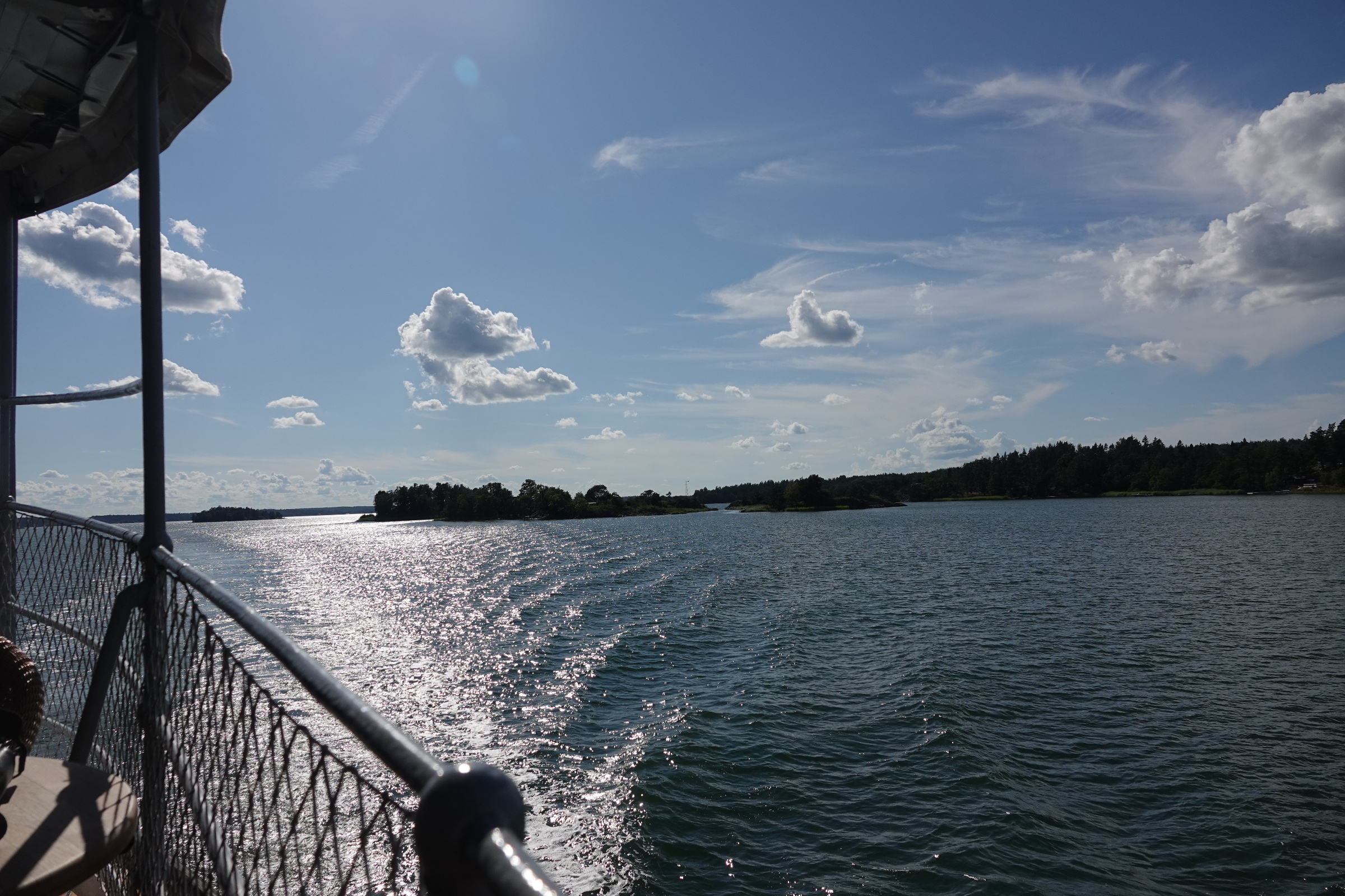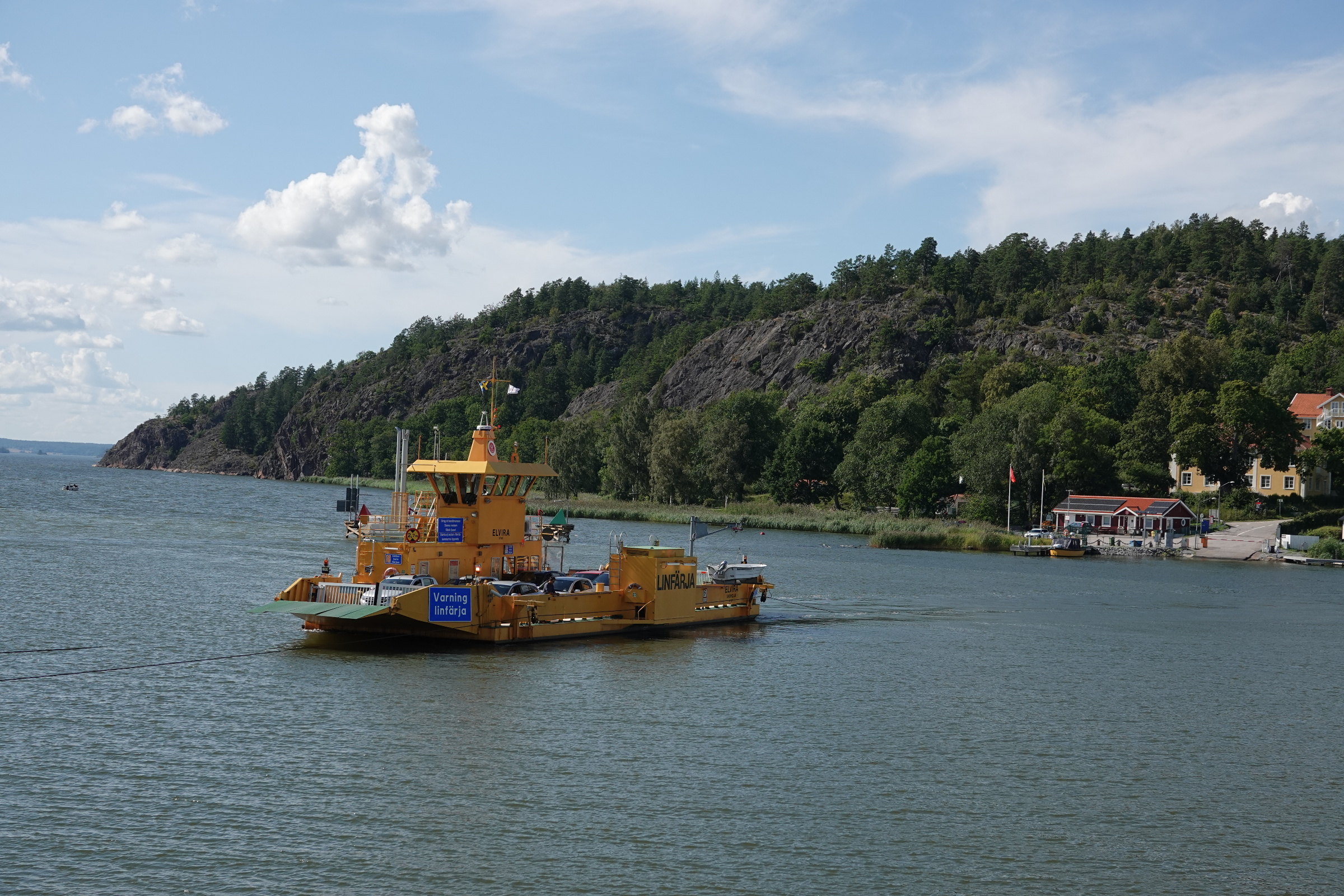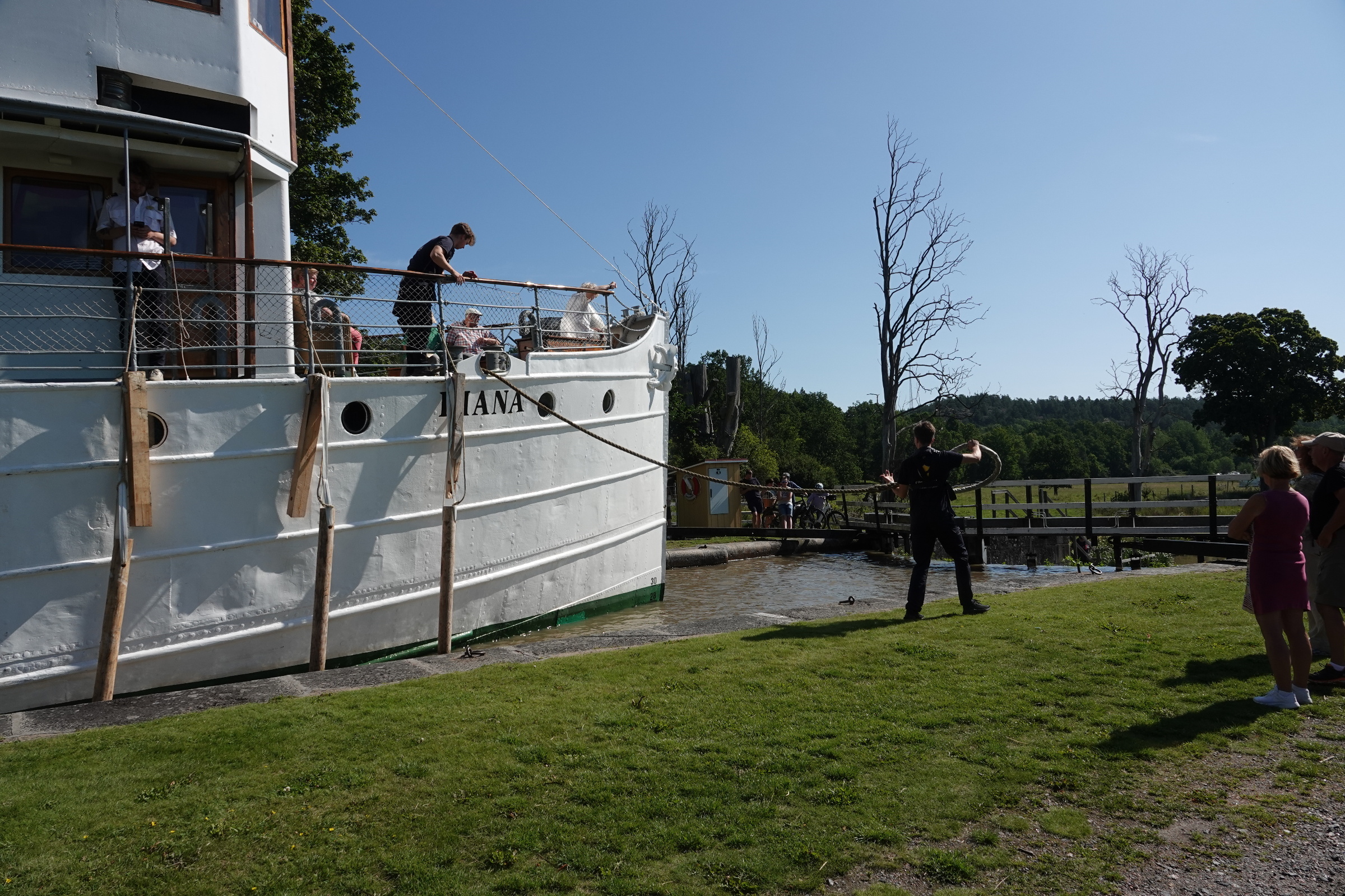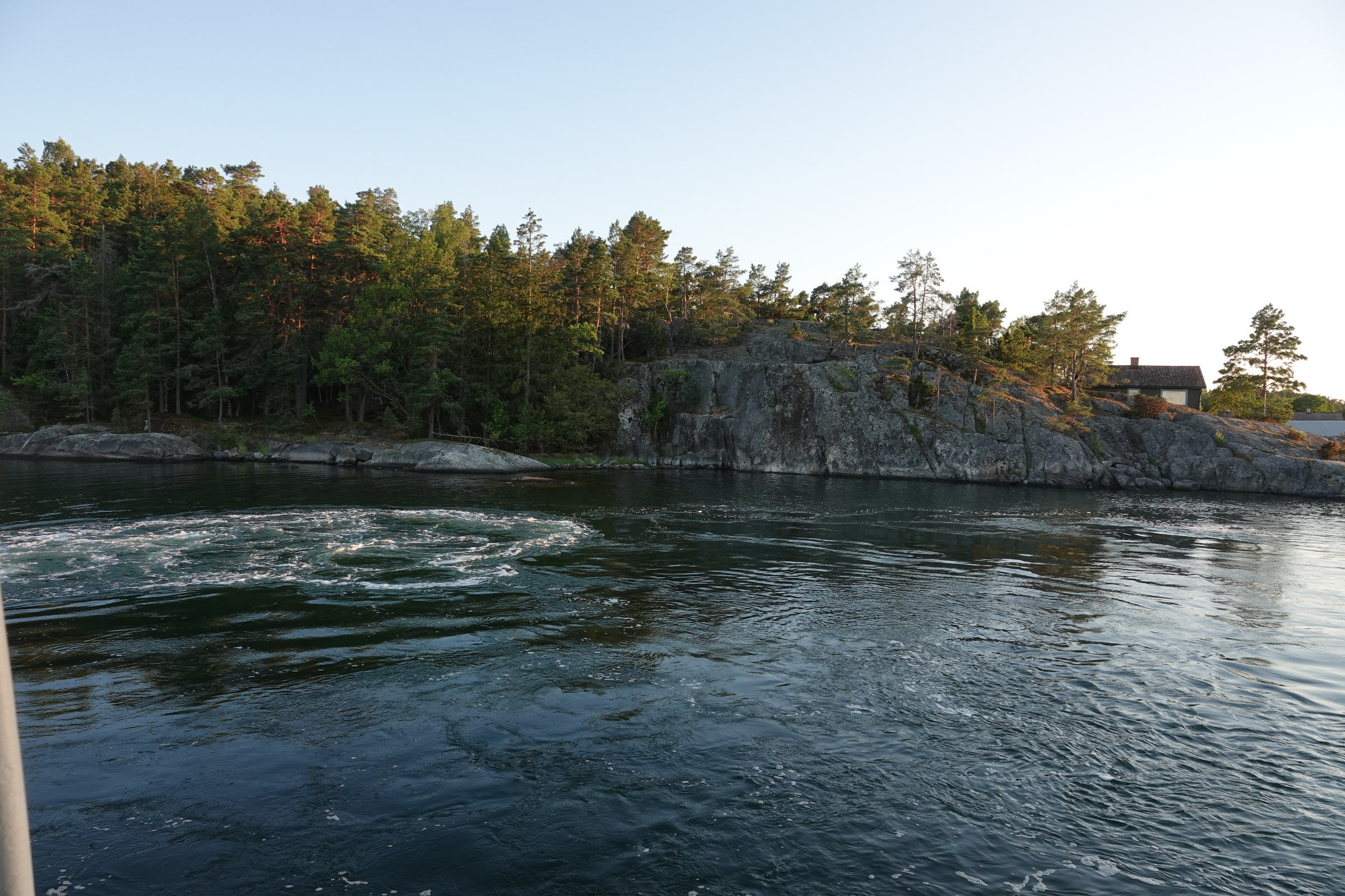 Am frühen Nachmittag erreichen wir die Schleuse von Mem, die 1831-32 als letzte Schleuse des Kanals erbaut wurde. Hier wurde der Göta Kanal am 26. September 1832 feierlich in Gegenwart des Königs Karl XIV Johan mit Familie eingeweiht. Hier ist das östliche Ende des Göta Kanals, wir fahren hinaus in die Ostseebucht Slätbaken. Nach einer kurzen Passage durch die offene See kreuzt das Schiff zwischen den Schären.