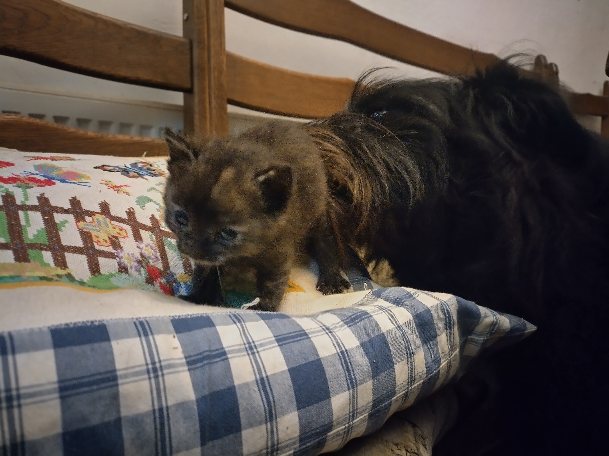 Ohne Mutter und ohne Geschwister wurde das Schildpatt-farbene kleine Katzenmädchen von unserer Nachbarin Helga im Kuhstall gefunden.