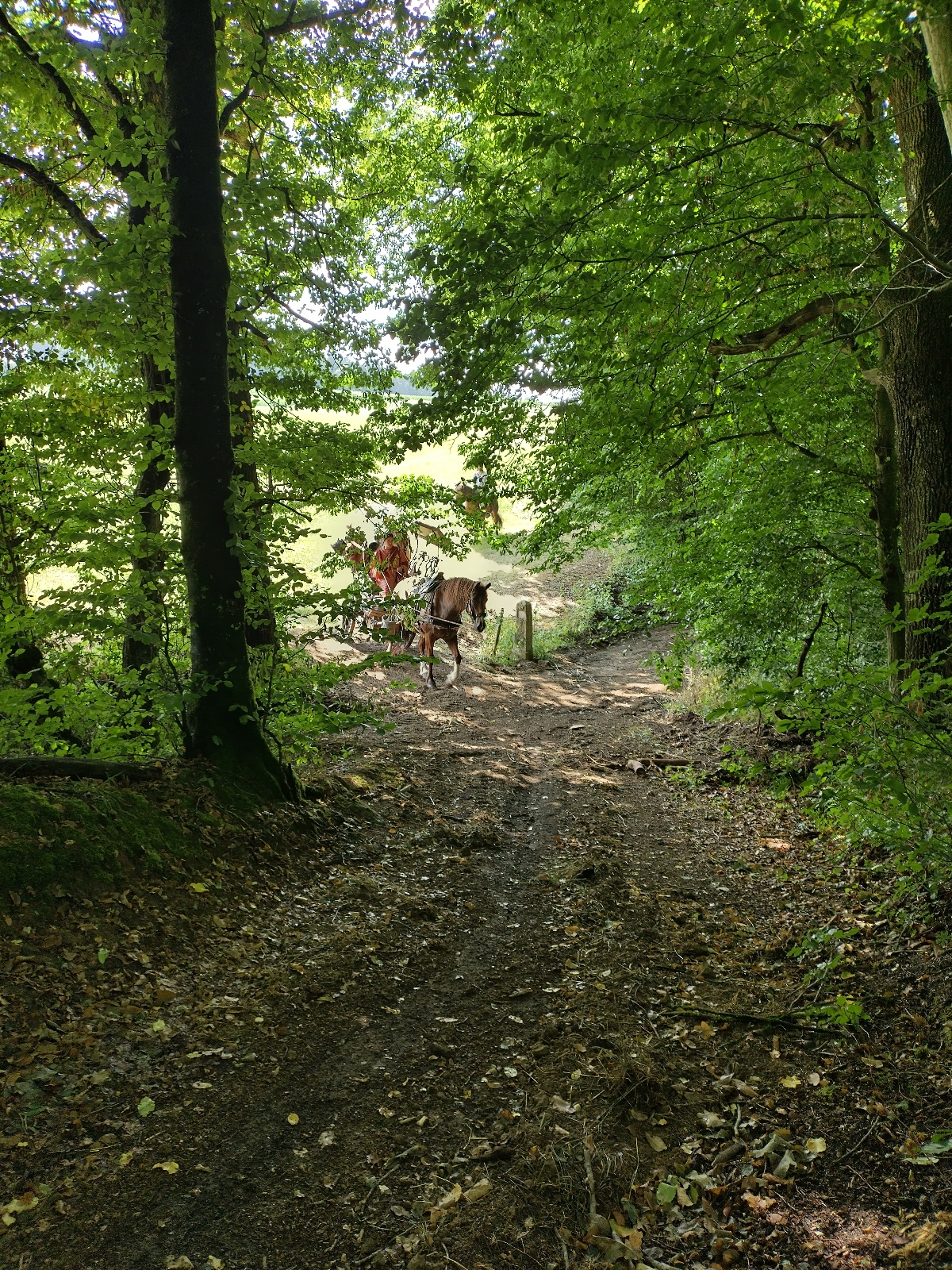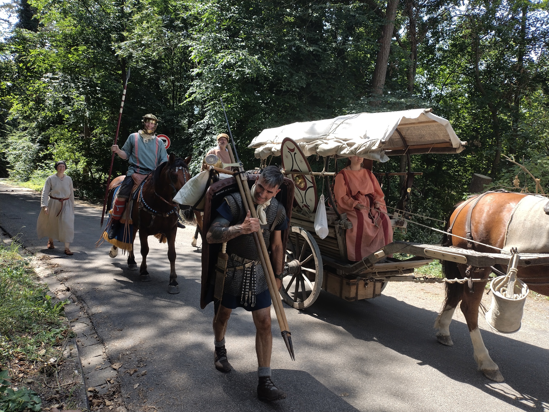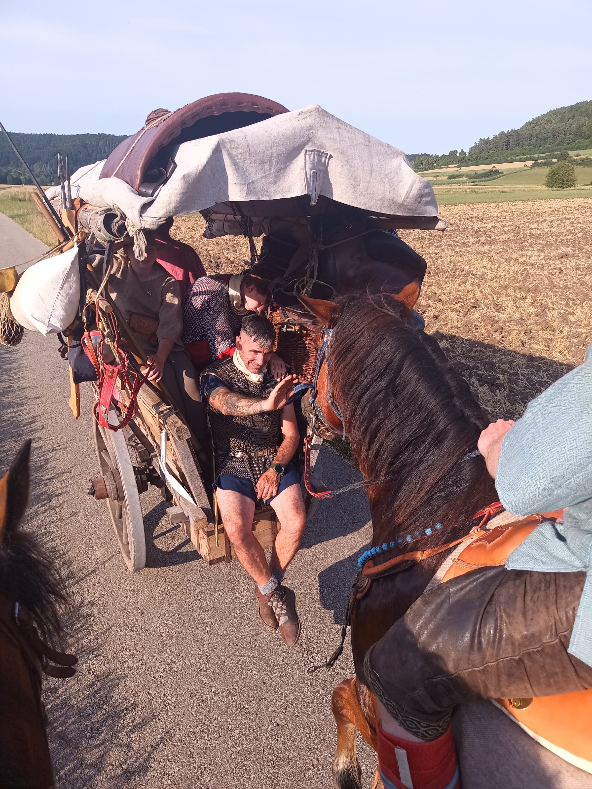 Luisa fährt den Wagen, Jan reitet Verano, Bert sitzt auf Lina, der Rest fährt auf dem Wagen oder geht streckenweise zu Fuß. Da wir heute kein Publikum erwarten, sind beide Pferde nicht römisch gesattelt ohne Steigbügel, sondern tragen die normalen Alltagssättel. Bei den jungen Pferden ist es sinnvoll, erst einmal langsam und vorsichtig loszulegen, denn sie sind auf jeden Fall aufgeregt.
