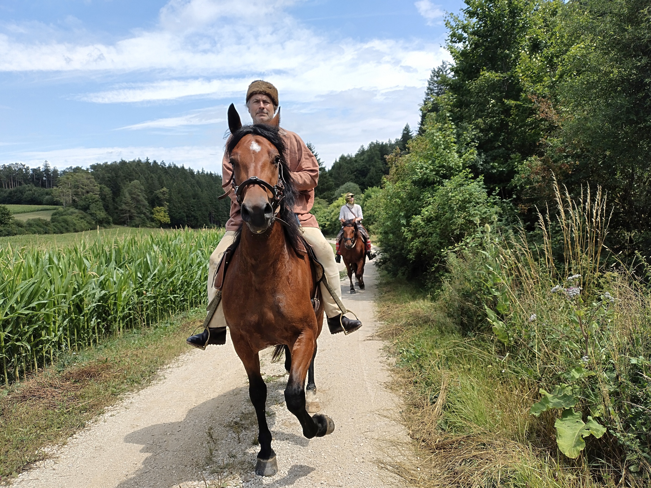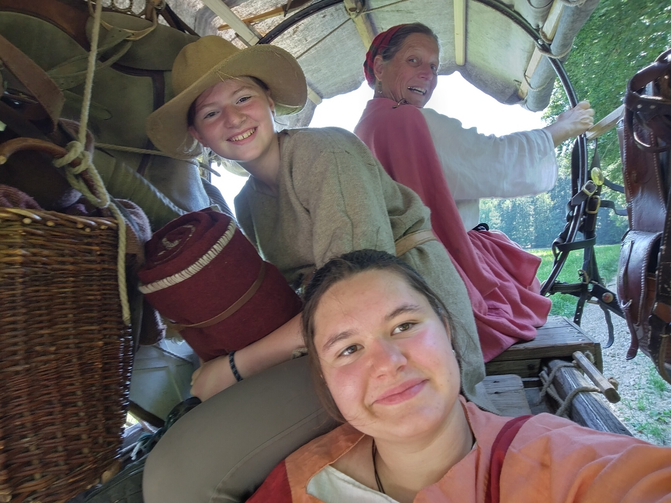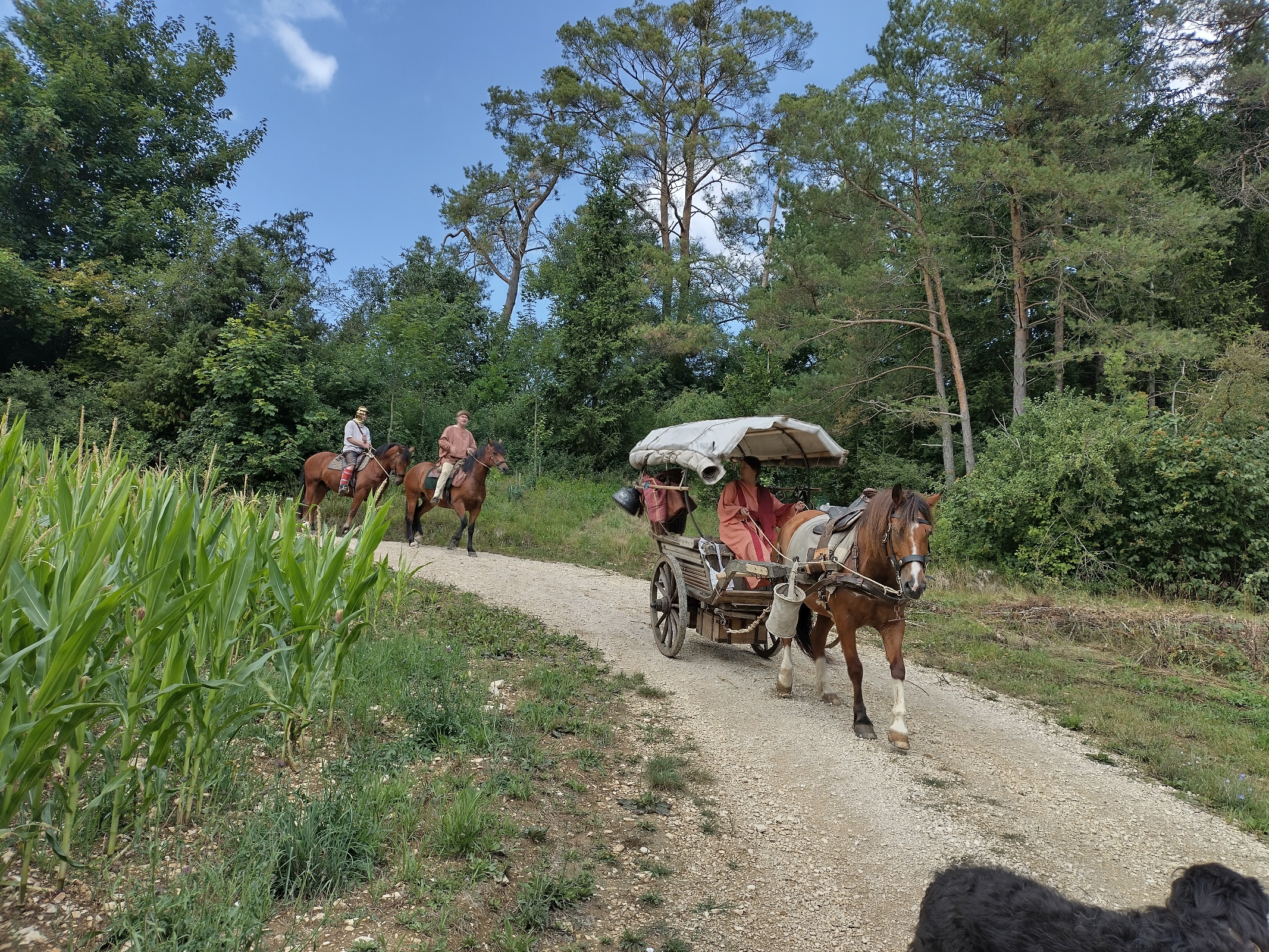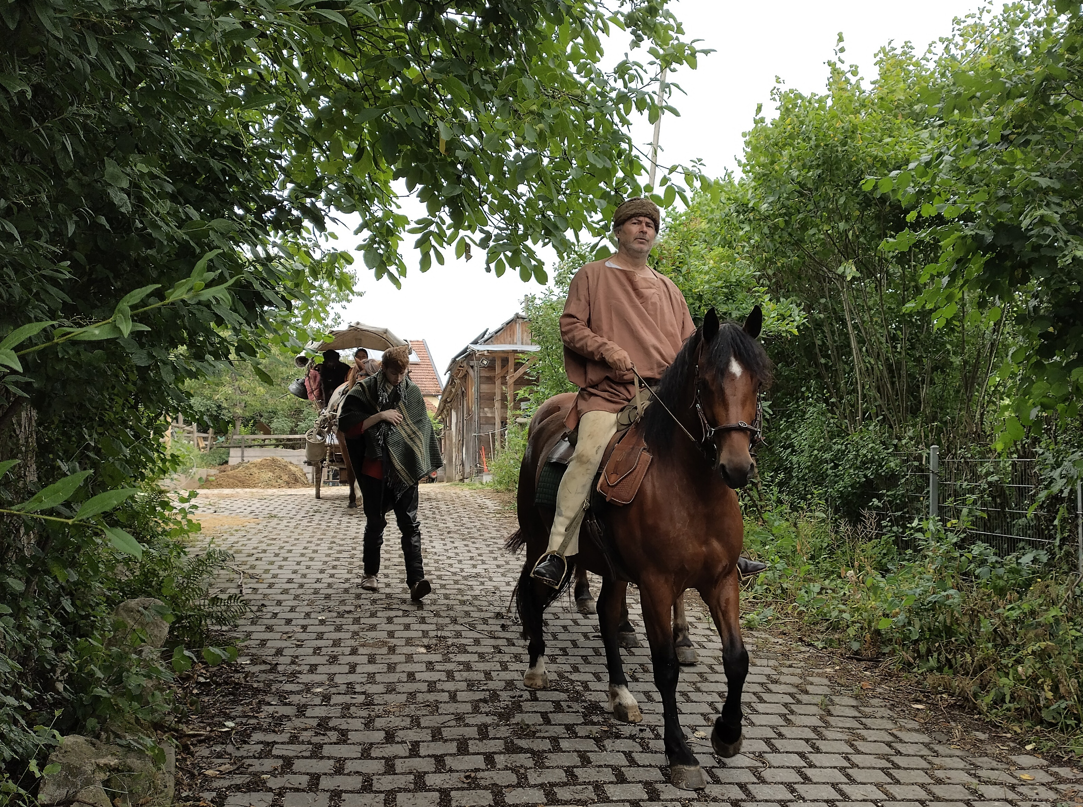 Luisa fährt den Wagen, Jan reitet Verano, Bert sitzt auf Lina, der Rest fährt auf dem Wagen oder geht streckenweise zu Fuß. Da wir heute kein Publikum erwarten, sind beide Pferde nicht römisch gesattelt ohne Steigbügel, sondern tragen die normalen Alltagssättel. Bei den jungen Pferden ist es sinnvoll, erst einmal langsam und vorsichtig loszulegen, denn sie sind auf jeden Fall aufgeregt.
