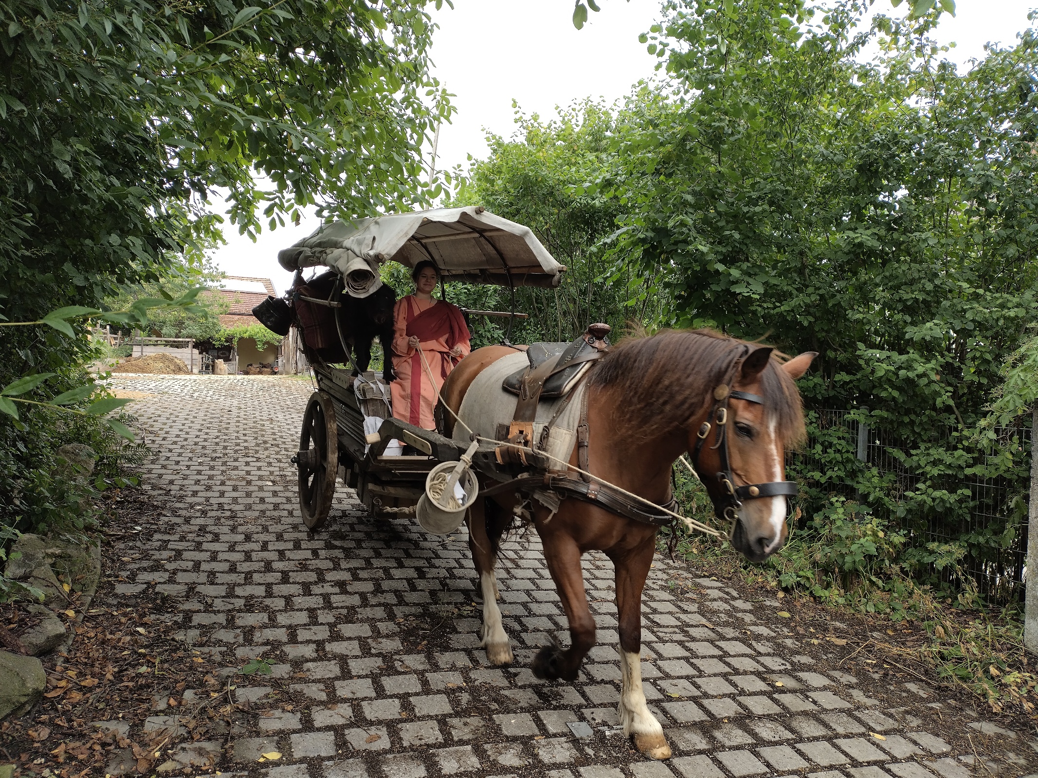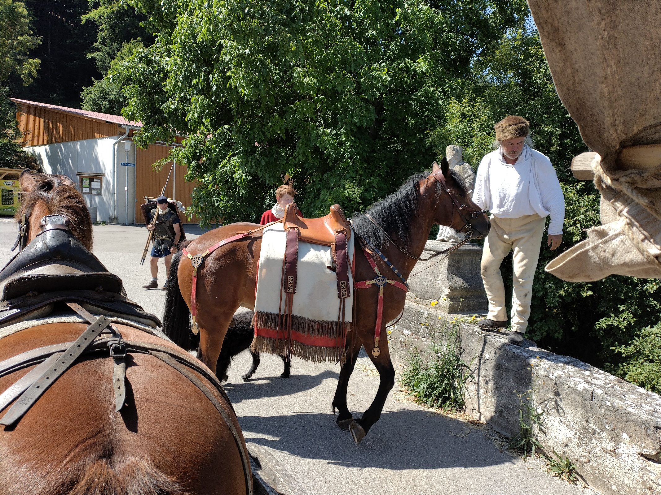 Da wir in Pfünz ordentlich einreiten wollen, werden Verano und Lina heute beide römisch gesattelt. Die modernen Sättel befestigen wir am Fuhrwerk - zu all dem anderen Zeug, das da eh schon dranhängt. Aufsteigen ohne Steigbügel gestaltet sich ein bißchen schwierig. Zum Glück gibt's Brückengeländer.