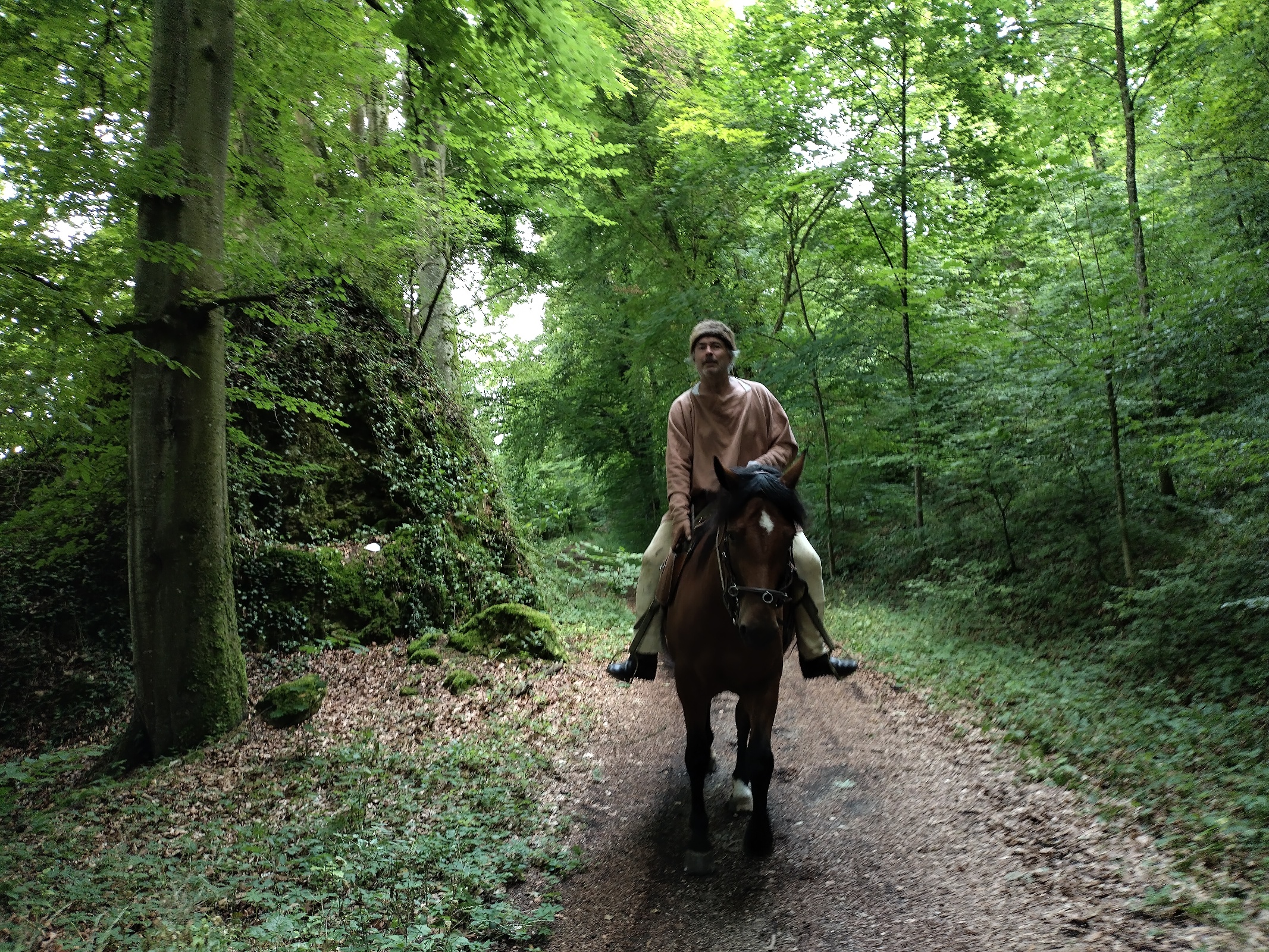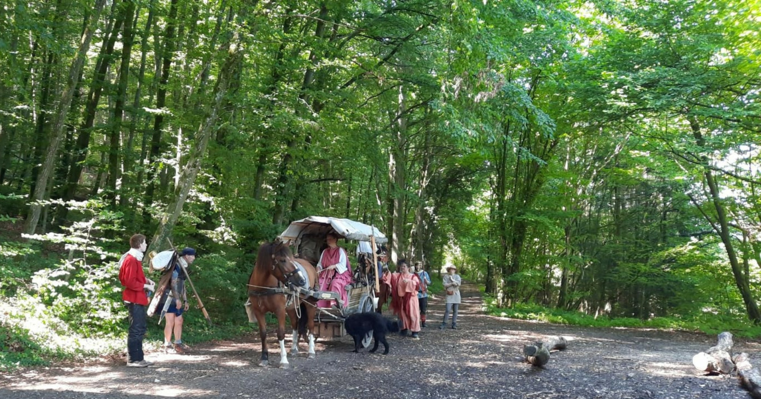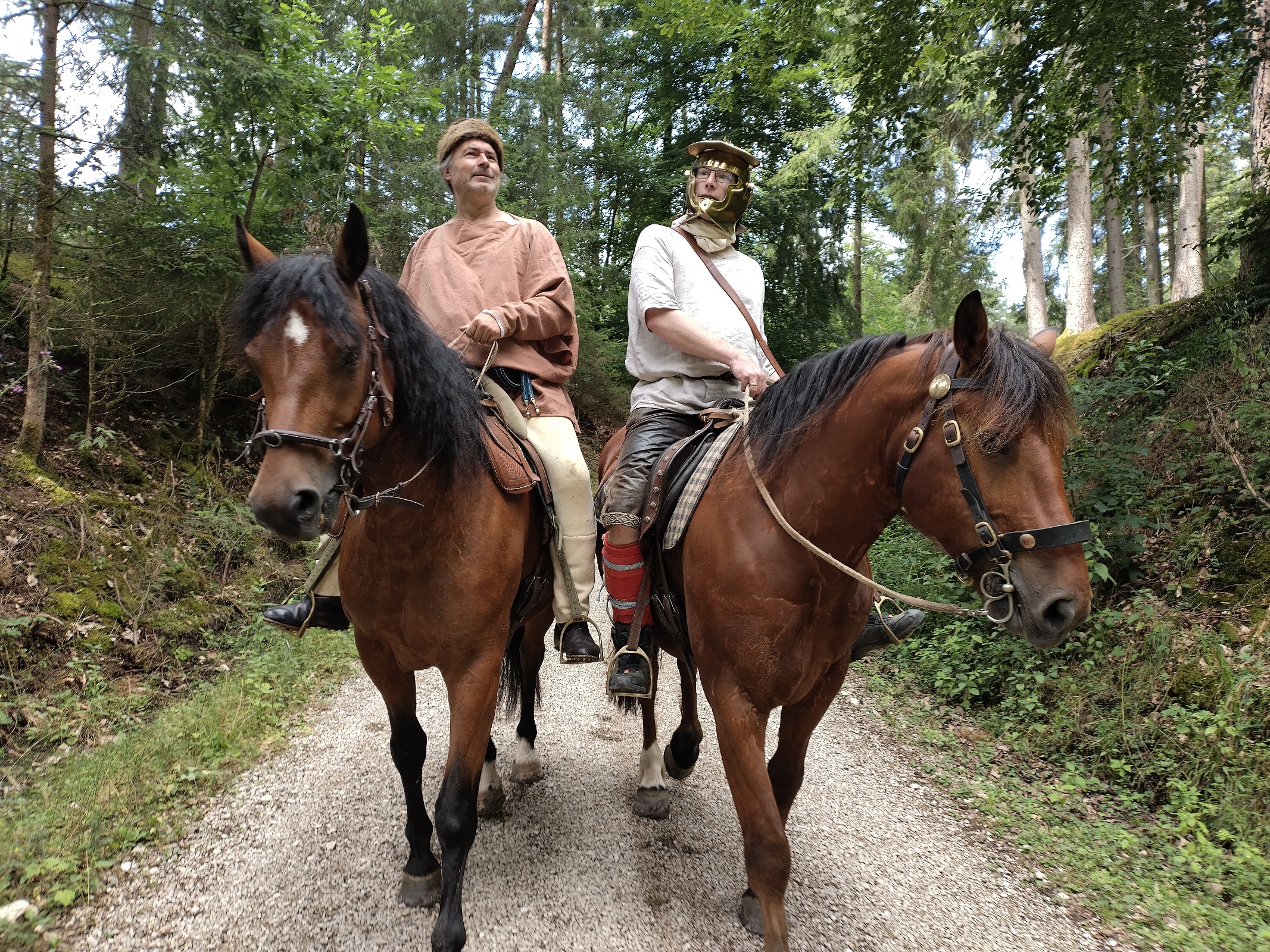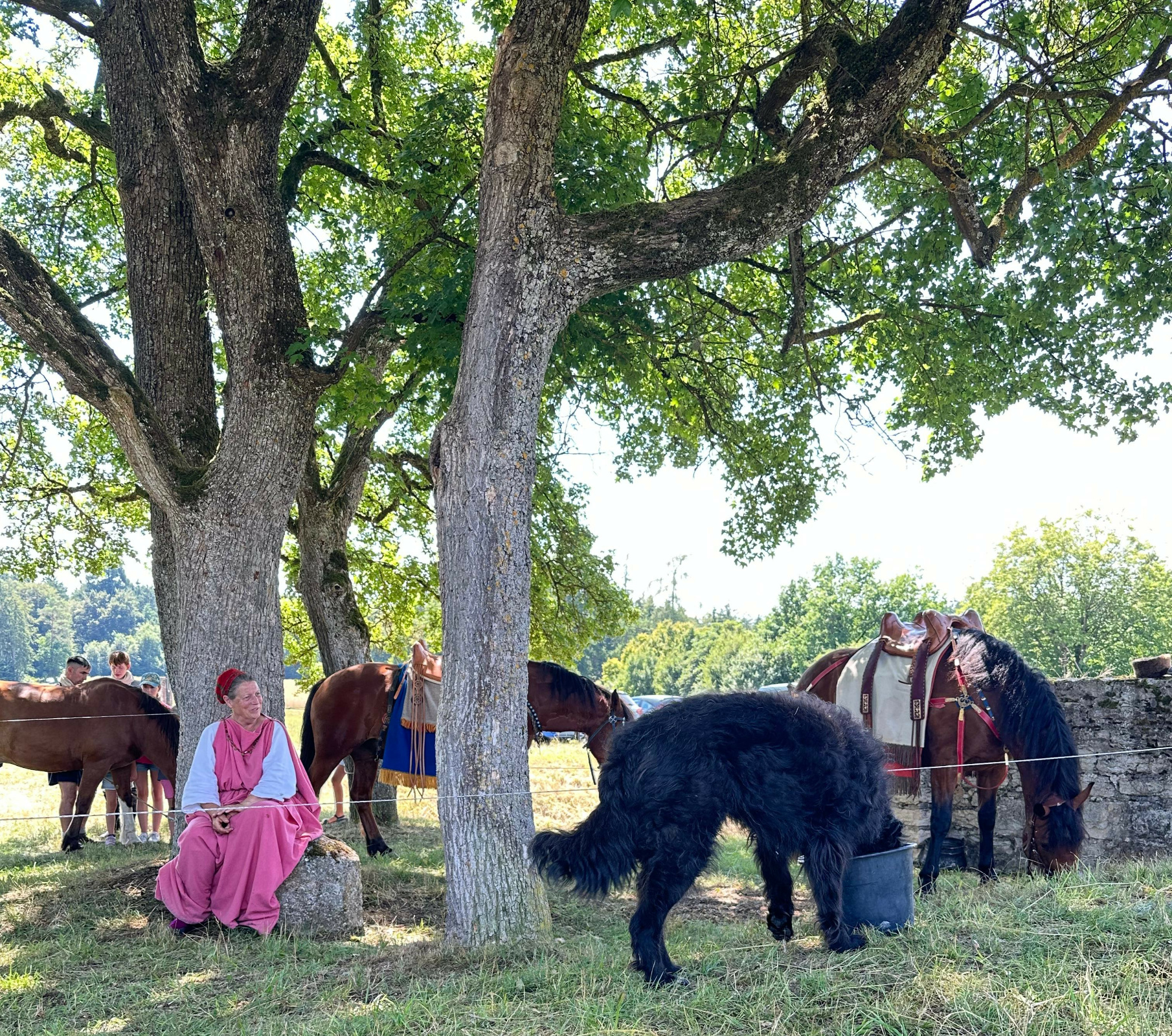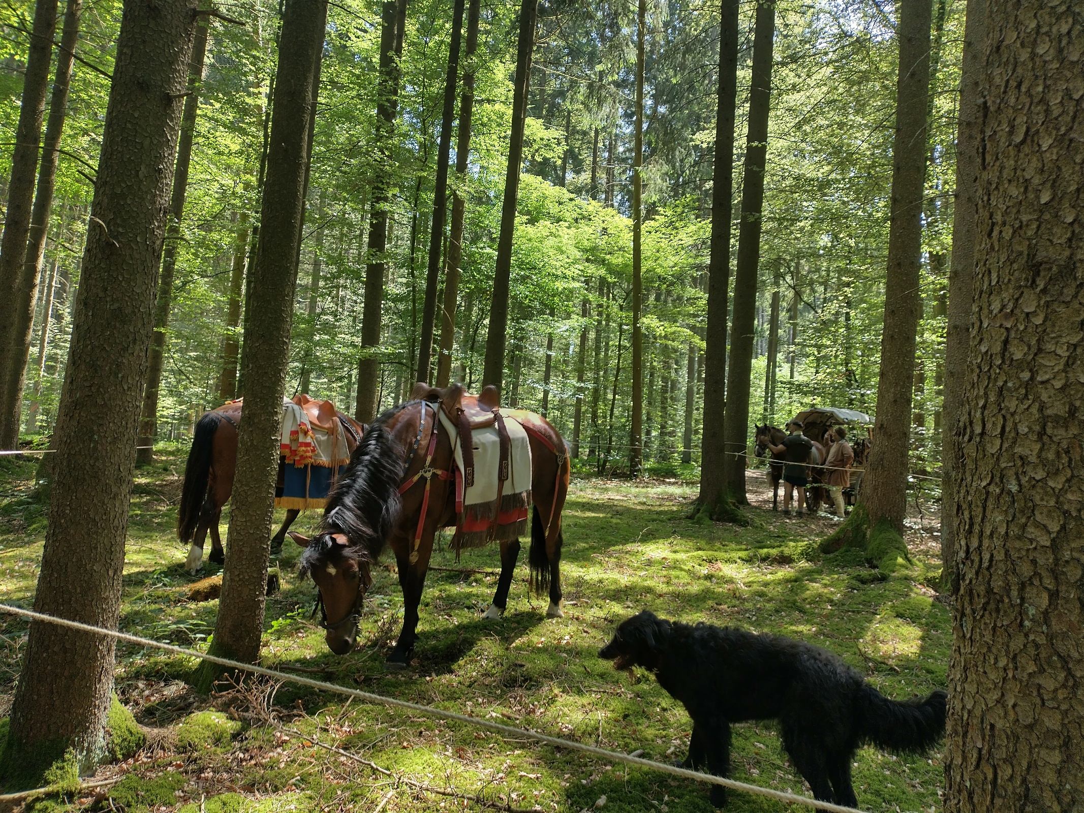 Wir erreichen unser Ziel frühzeitig und machen eine ausgiebige Pause im Wald an der Römerstraße, kurz vor dem Kastell Vetoniana. Wir haben so viel Zeit, daß es sich lohnt, komplett auszuspannen und für die Pferde eine provisorische Koppel zwischen den Bäumen einzuzäunen. Wir haben ja genug Seil dabei. Die Veranstaltung beginnt erst um 13:00 Uhr und wir wollen zum richtigen Zeitpunkt eintreffen.