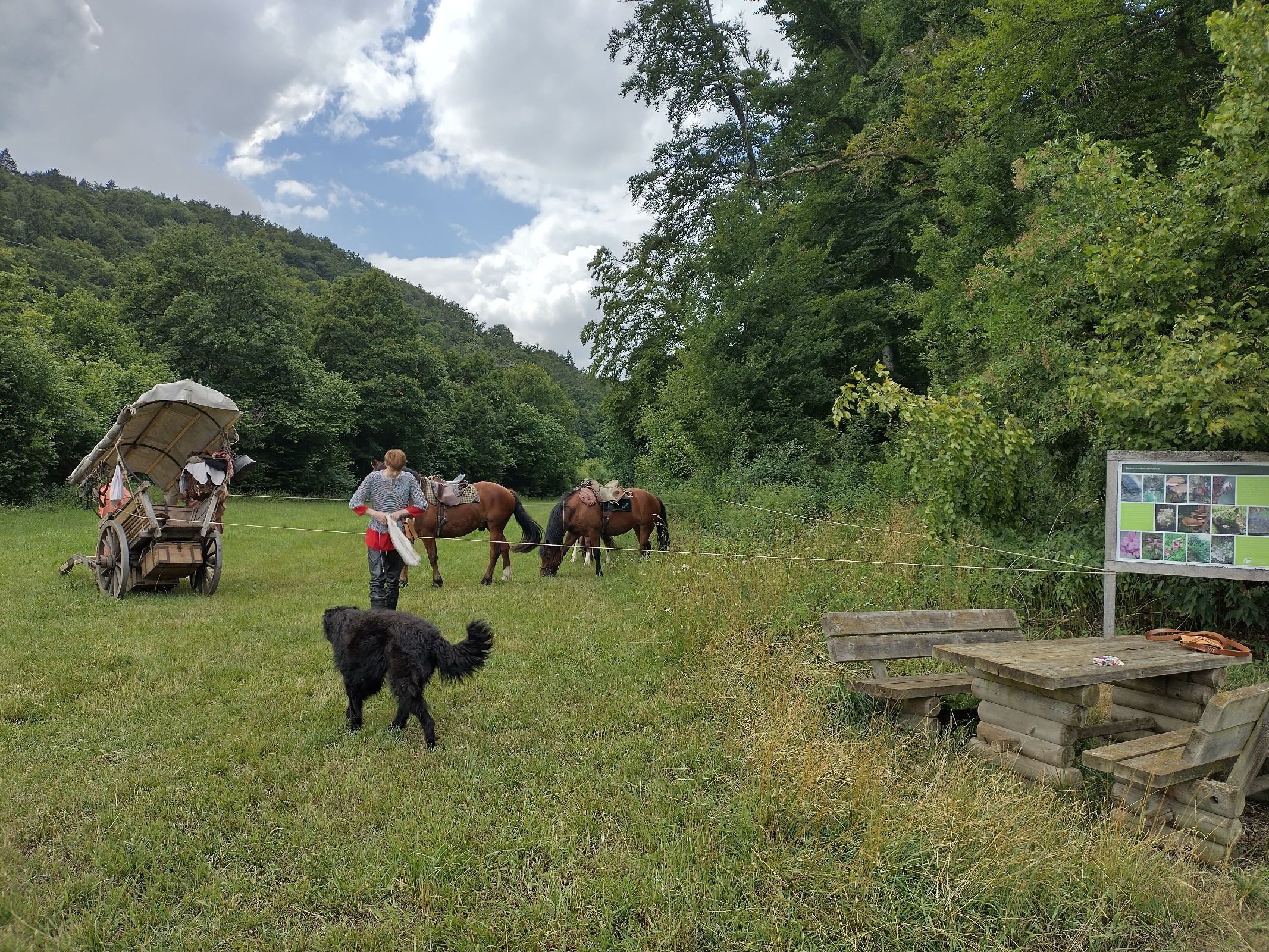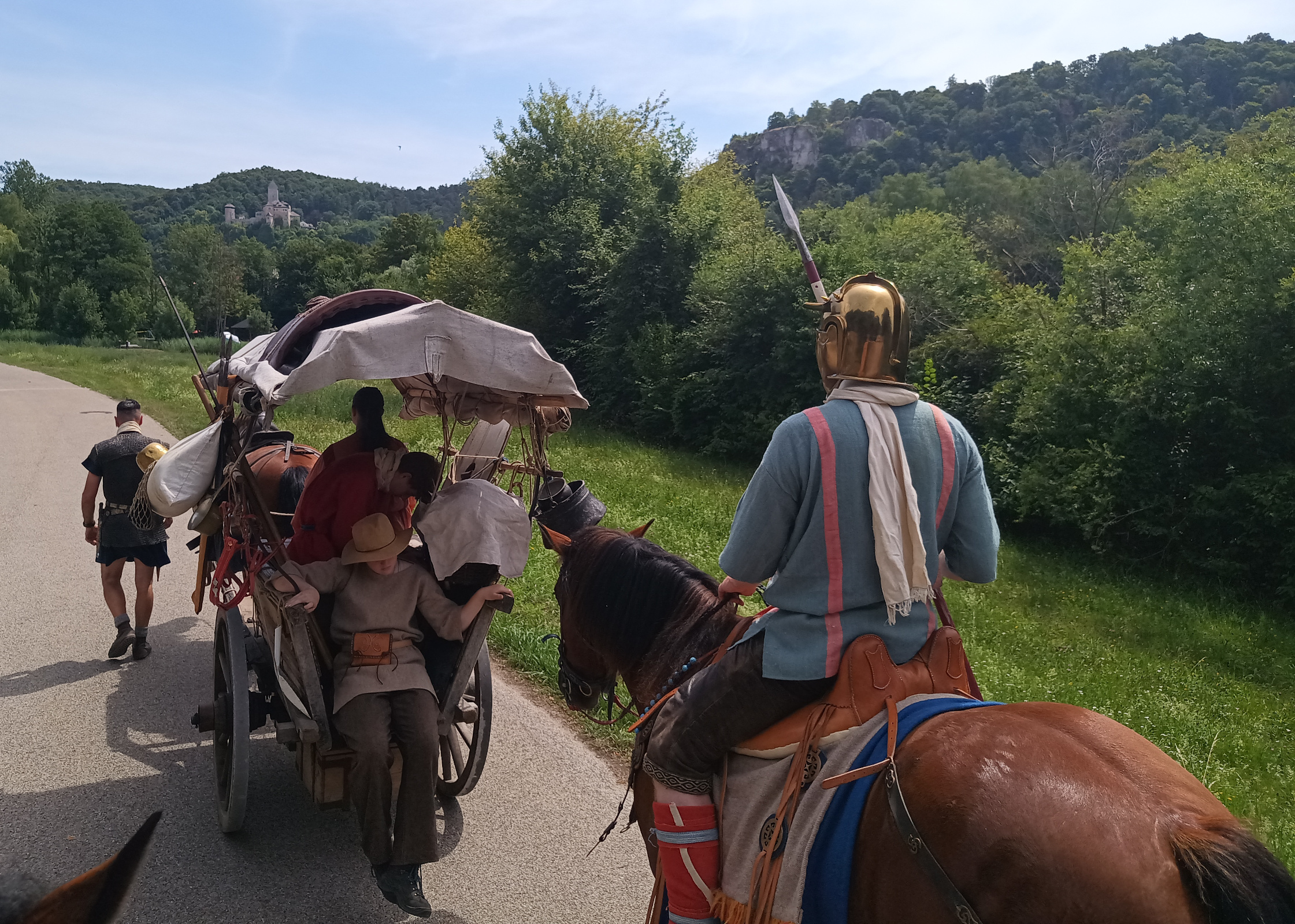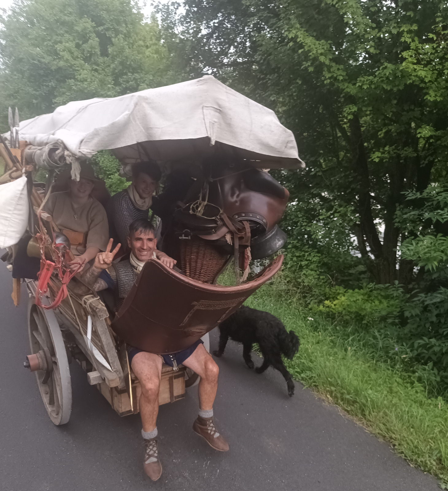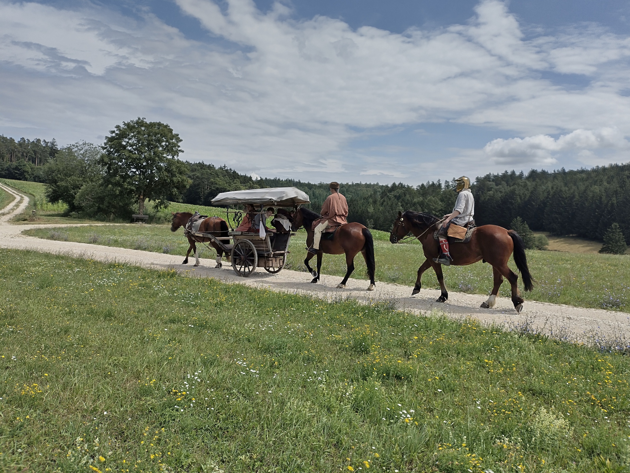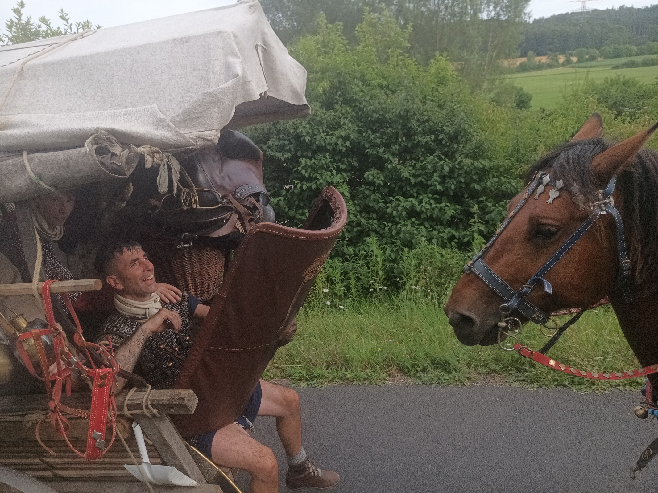 Da Petra und Luisa nach Eichstätt ins Krankenhaus gefahren sind und nur noch sechs Personen unterwegs sind, beschliessen wir, daß wir Gas geben können. Jan und Bert reiten, Henrike steuert den Karren, Swinta und Silvan sitzen zu zweit auf der hinteren Kiste und Michl hockt hinten im Wagen, mit seiner kompletten Ausrüstung. Er ist fast nicht mehr zu sehen hinter seinem Schild. Jetzt können wir aber einen Zahn zulegen und weite Strecken auf dem ebenen glatten Radwanderweg traben.