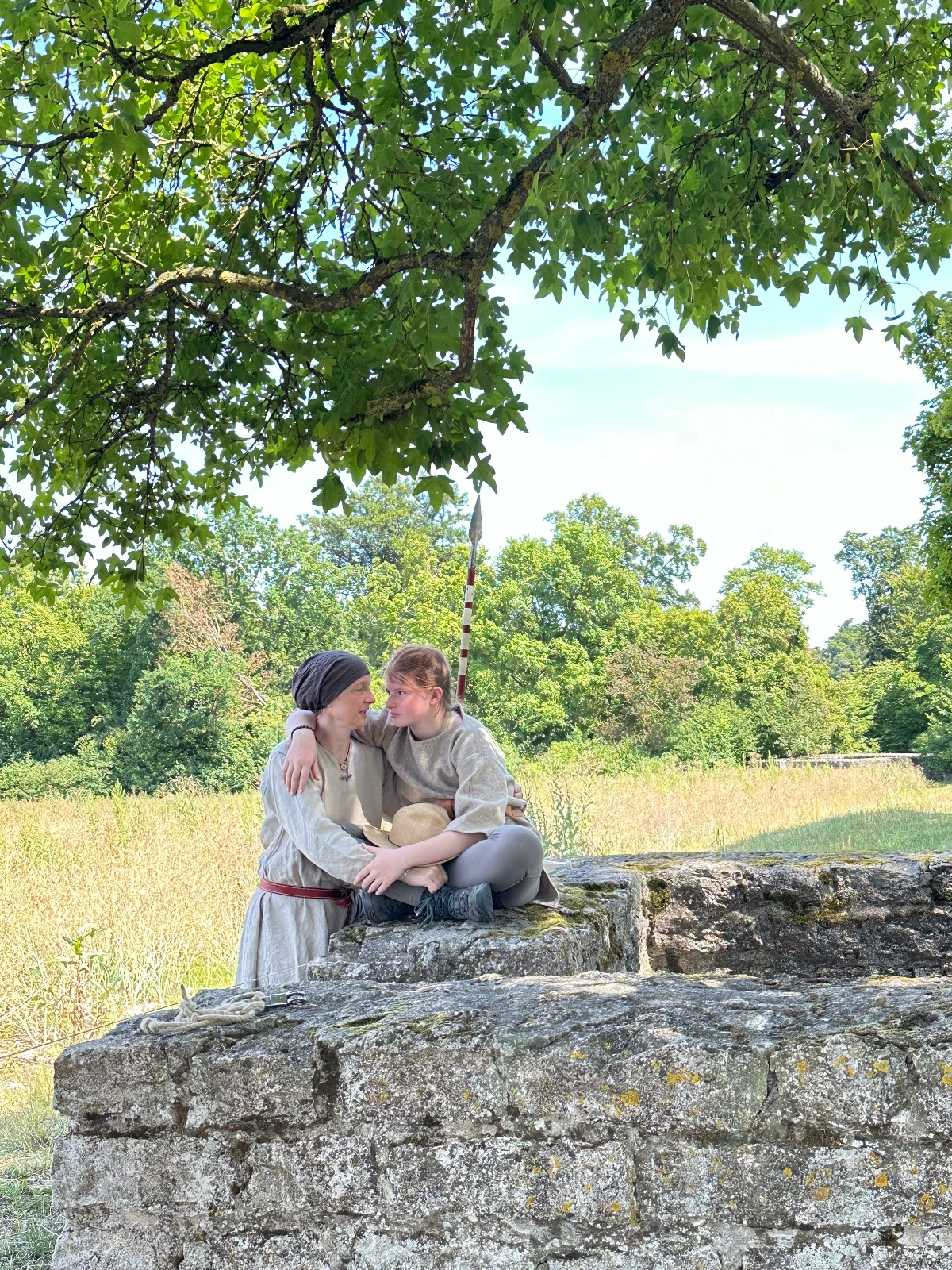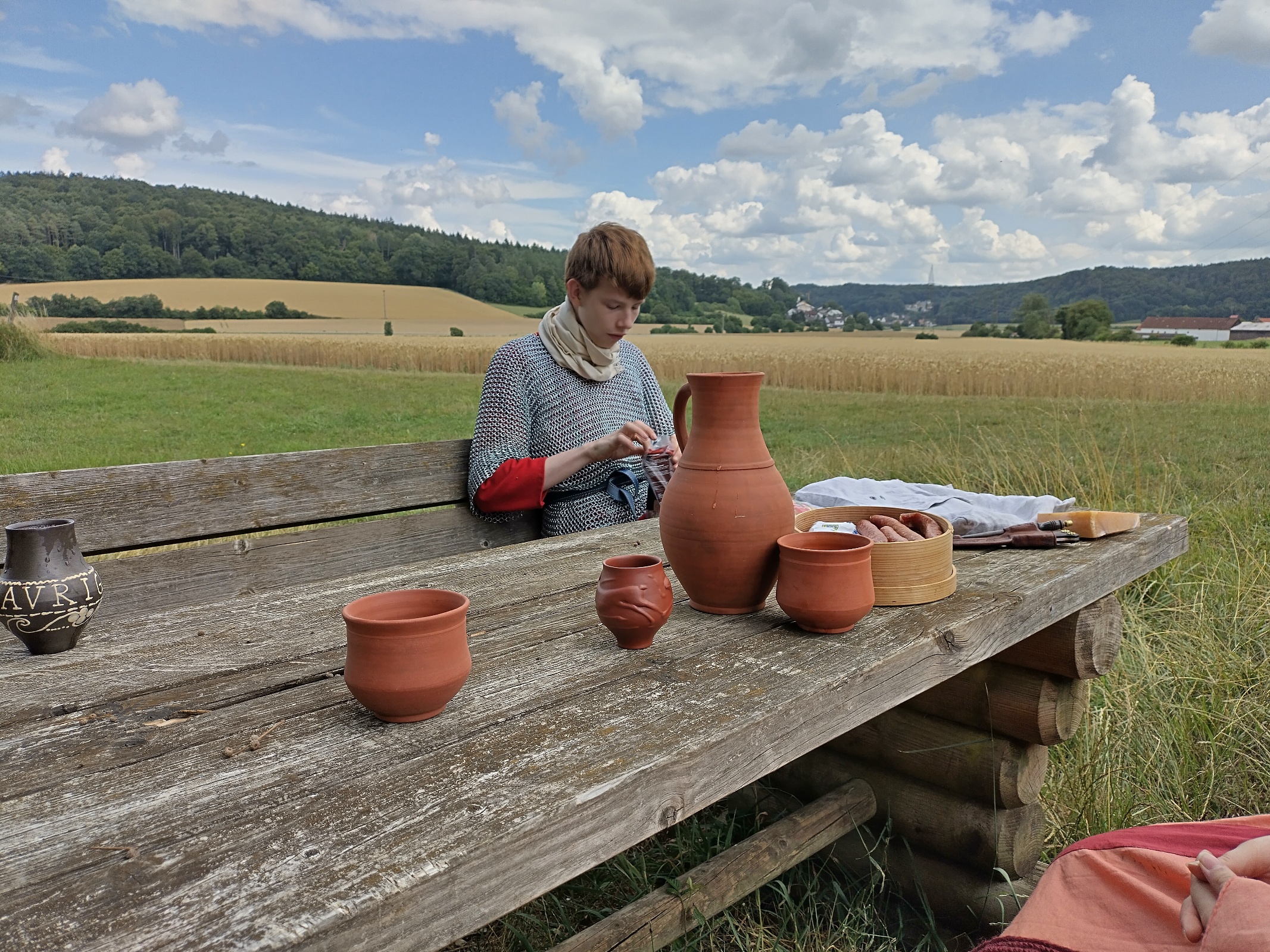 Berts Schwester (Luisas Mutter) und Berts Onkel sind zu Besuch. Zu ihrem Schrecken trifft Luisa auch noch auf ihren Münchner Geschichtslehrer, der gerade irgendwelchen Leuten erzählte, daß er eine Schülerin in der Klasse hat, die auch "so etwas macht". Wir werden großzügig verpflegt mit römischen Leckereien: lukanische Würste, diverse Salate, frisch gebackenes Fladenbrot und Moretum. Ansonsten suchen wir uns ein Plätzchen im Schatten und lassen es uns gutgehen.