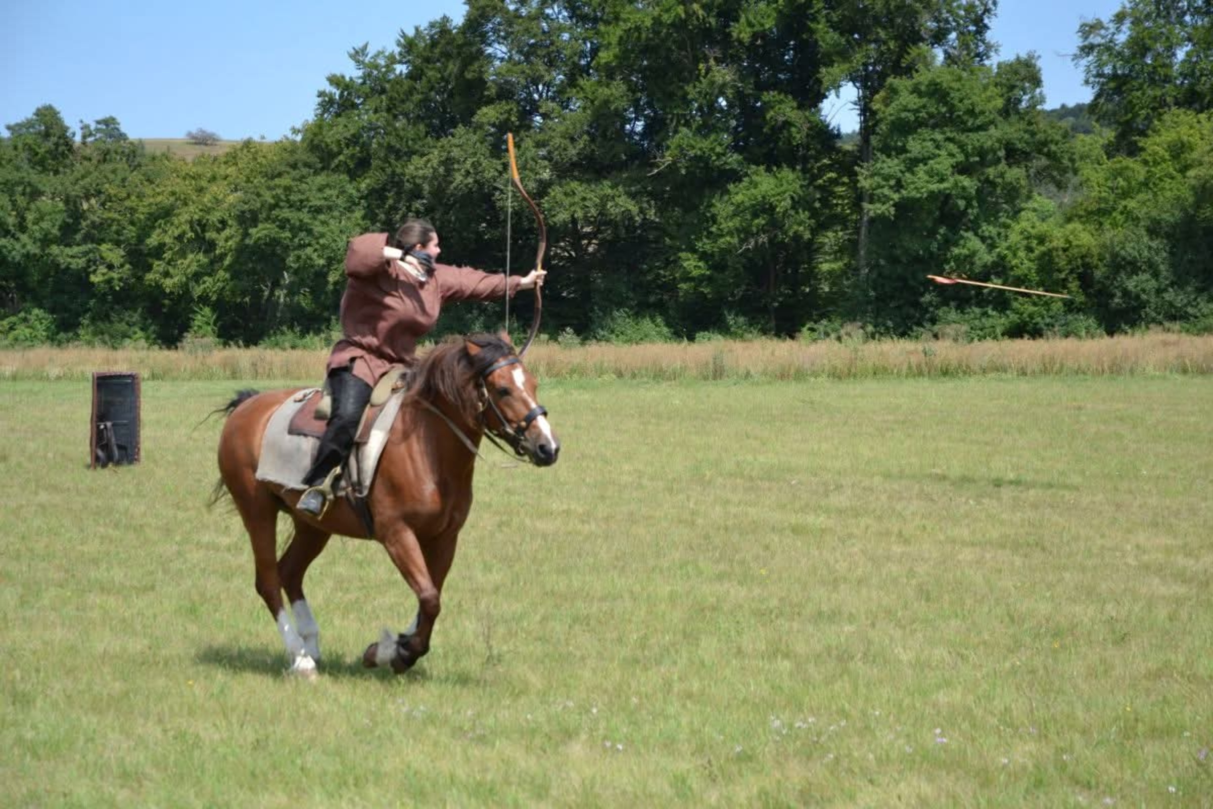 Luisa zeigt auf Rufus berittenes Bogenschiessen und das Publikum ist begeistert.