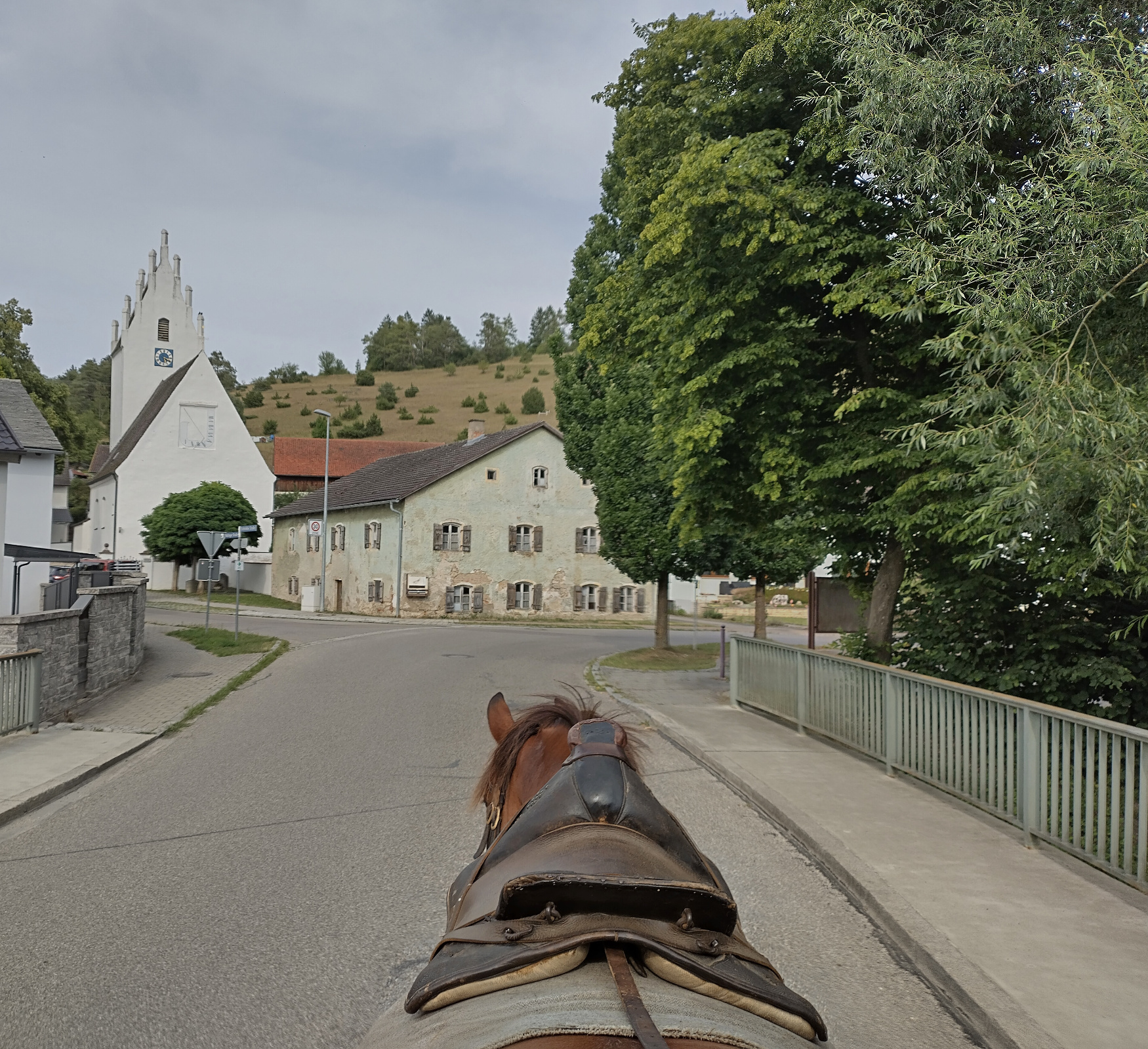 Heute sitzt übrigens Henrike auf dem Kutschbock und Verano wird streckenweise von Luisa geritten - vor allem in Eichstätt, da sie ihn einfach besser kennt und im Straßenverkehr im Falle einer kniffligen Situation vermutlich besser mit ihm zurecht kommen würde. Aber es ist gar nicht nötig, alle Pferde benehmen sich tadellos.
