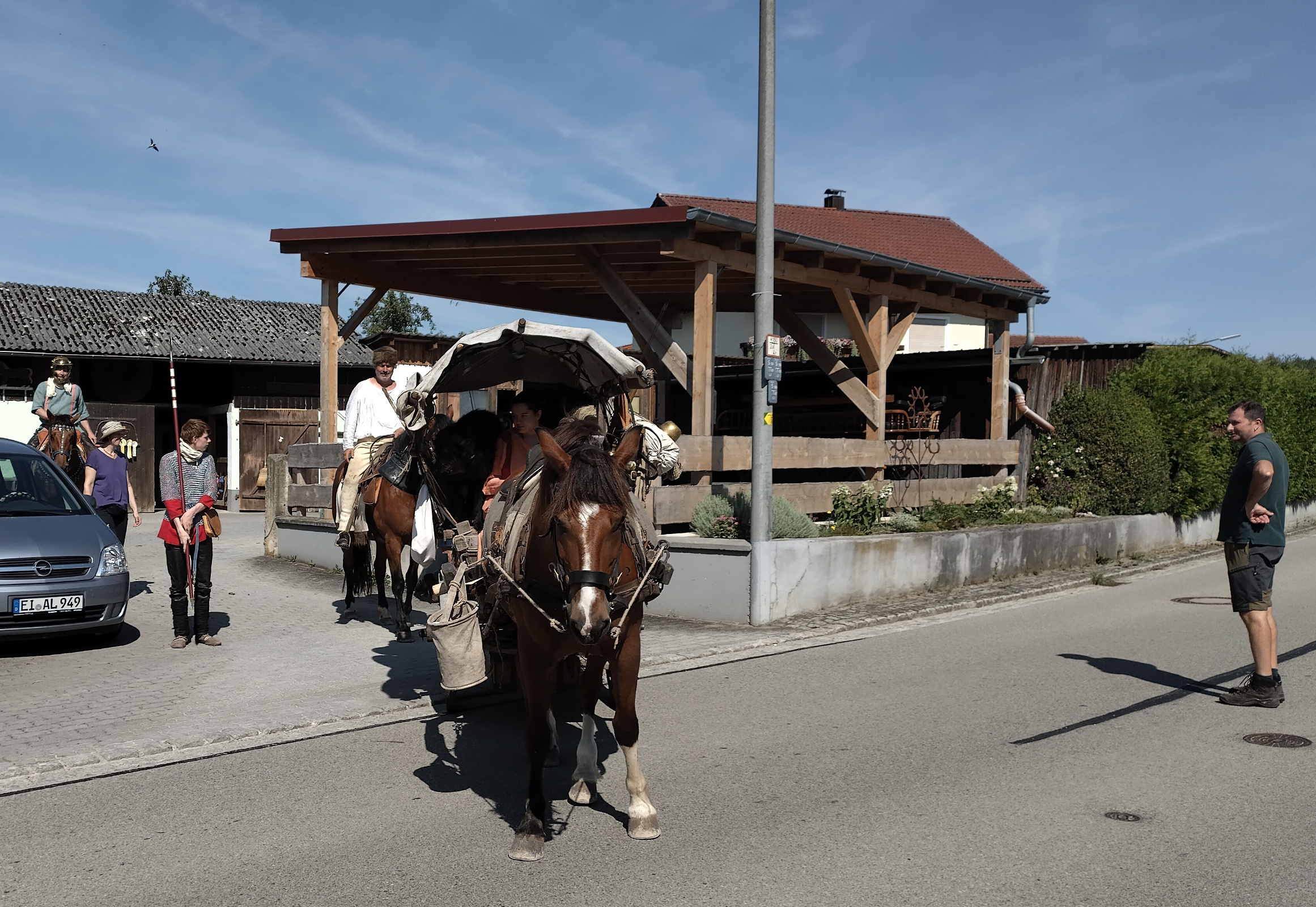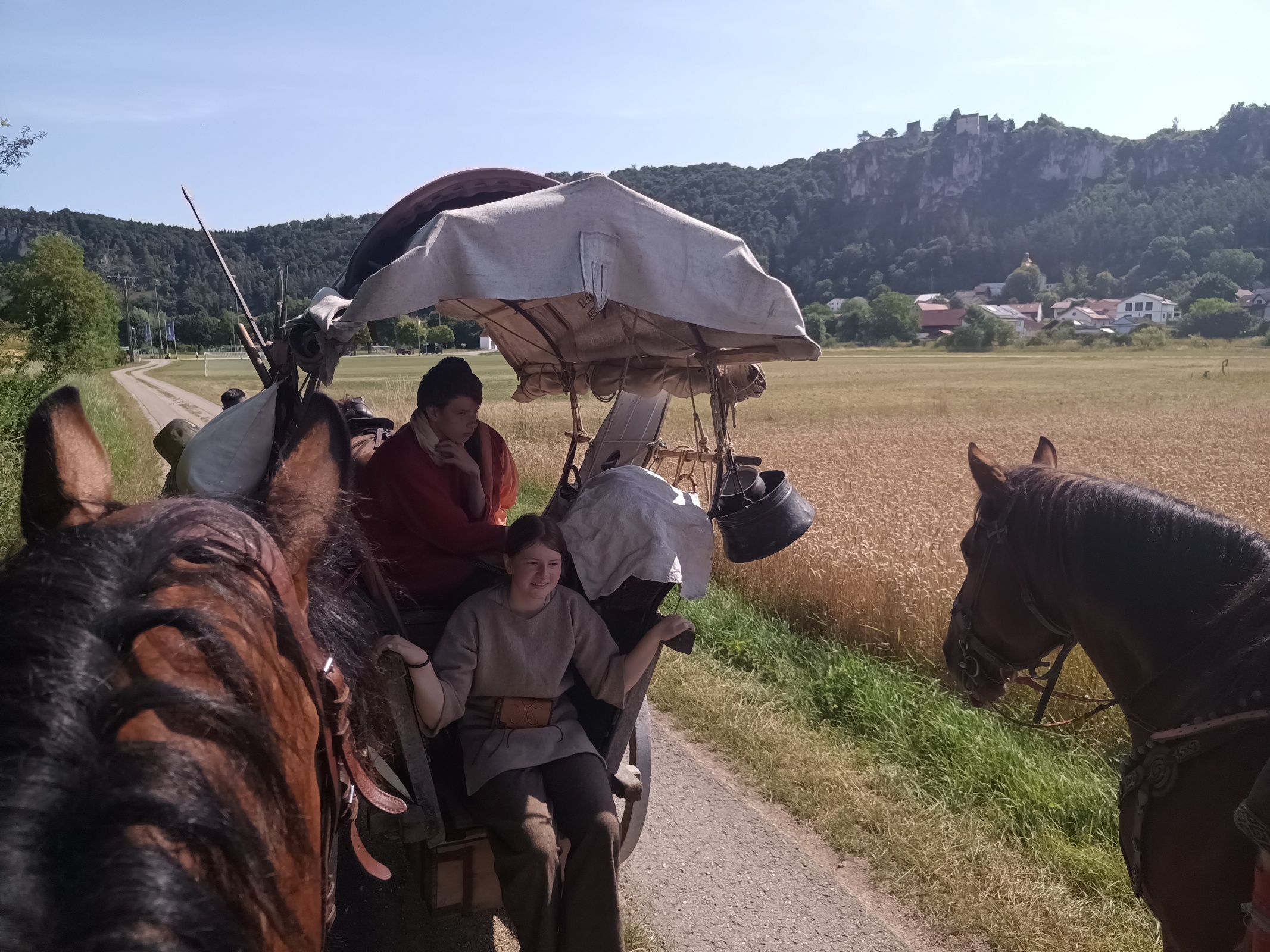 Luisa kann mit ihrem lädierten Knöchel nicht reiten, sie wird den Karren fahren. Henrike hat in der Nacht kaum geschlafen und ist völlig übernächtigt. Sie beschließt, nicht mit zu marschieren, sondern stattdessen Bus und Pferdehänger nach Kipfenberg zum Museum zu fahren und dort zu warten. Dafür kann sie noch in Ruhe den Aufbruch fotografieren.