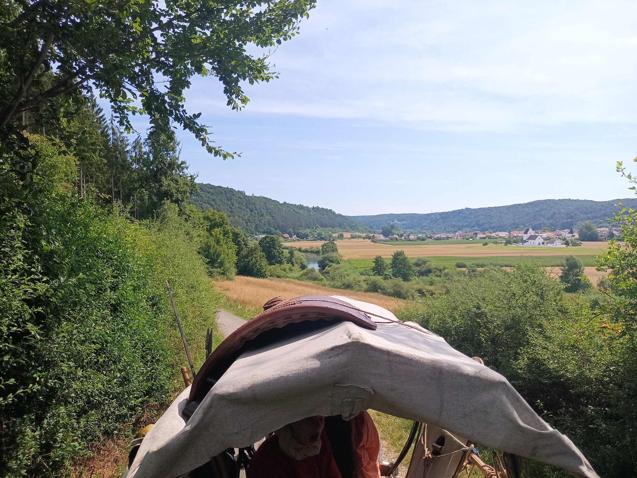 Wir gehen an der Gungoldinger Wacholderheide entlang, dann öffnet sich der Blick auf die Burg Arnsberg und die Arnsberger Leite. Michl läuft weite Strecken neben dem Fuhrwerk her, Rufus' Nüstern an seiner Hand - so wie das sonst sein Herrchen oft macht. Ein schönes und harmonisches Bild.