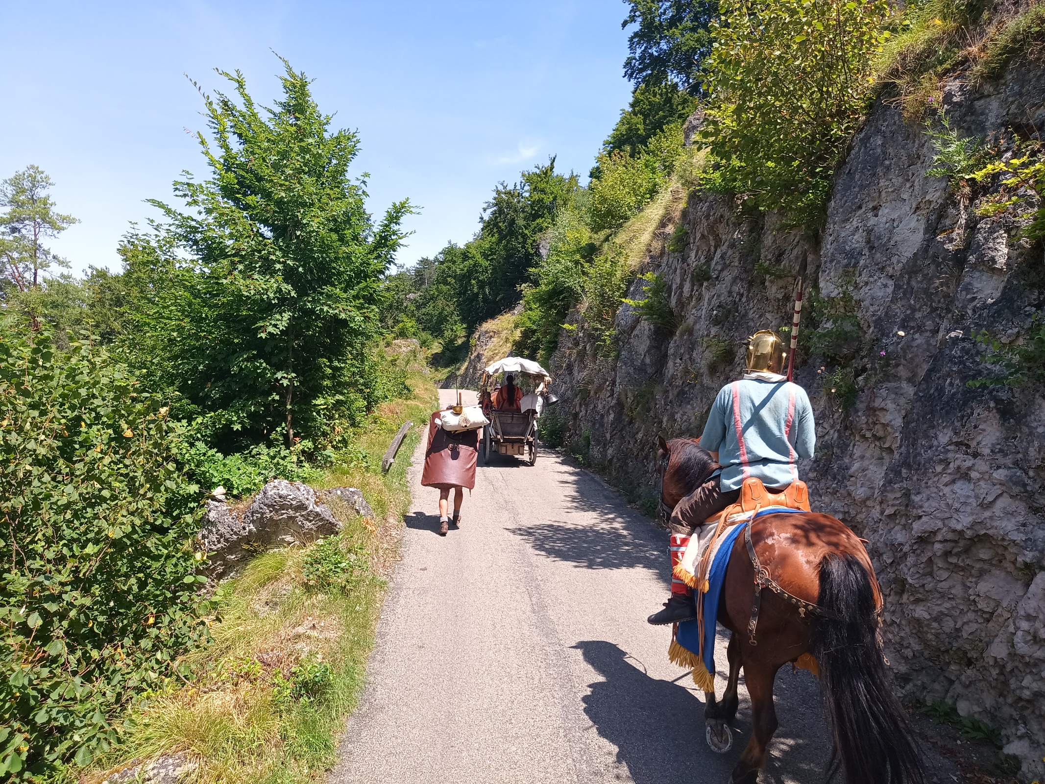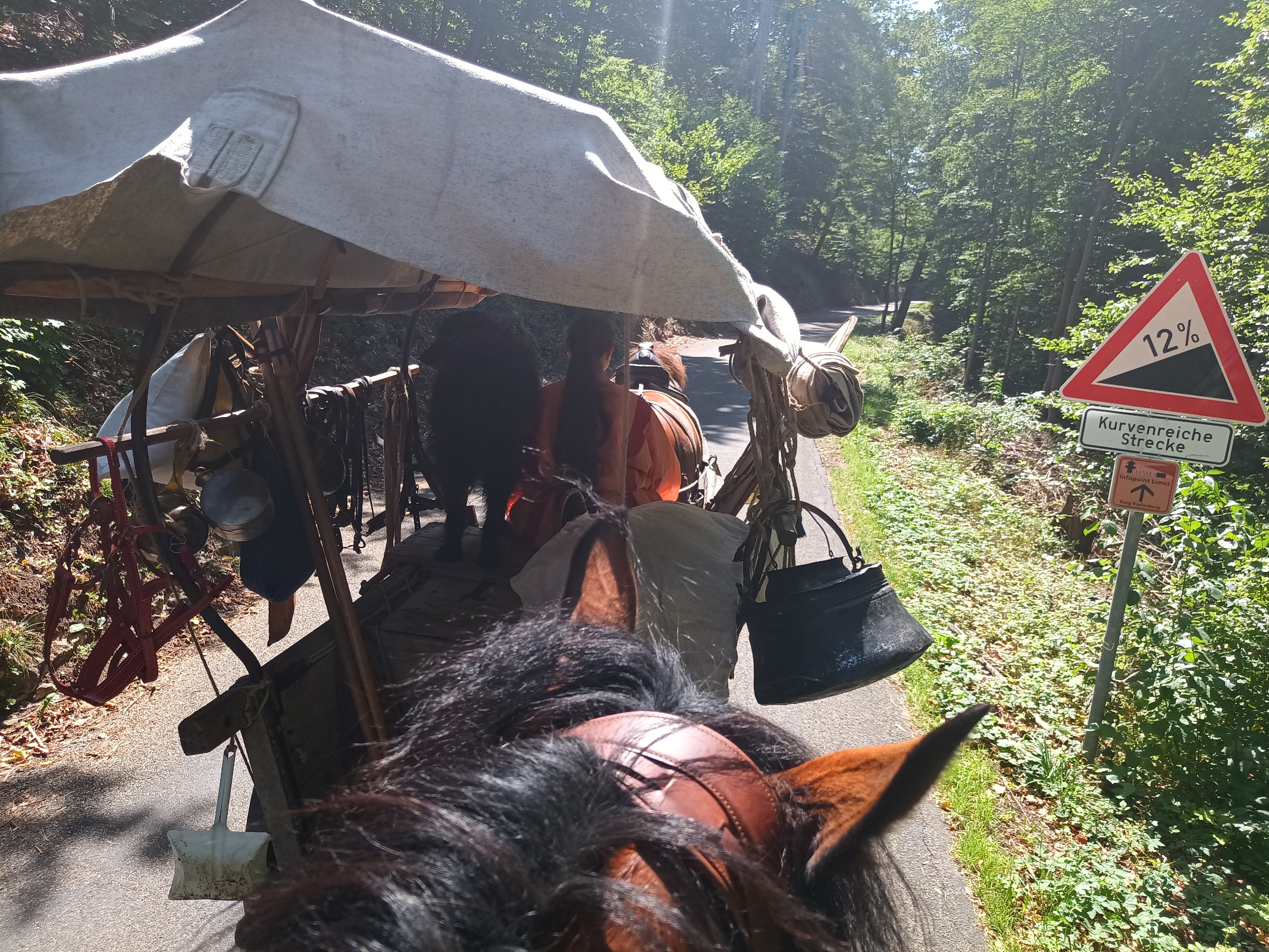 Gaaanz langsam und vorsichtig bremst Rufus den Karren die 20% steile Asphaltstraße vom Kastell Vetoniana zum Ort Pfünz hinunter. Jan und Michl hängen sich hinten dran und bremsen mit. Das ist anstrengend für alle Beteiligten.