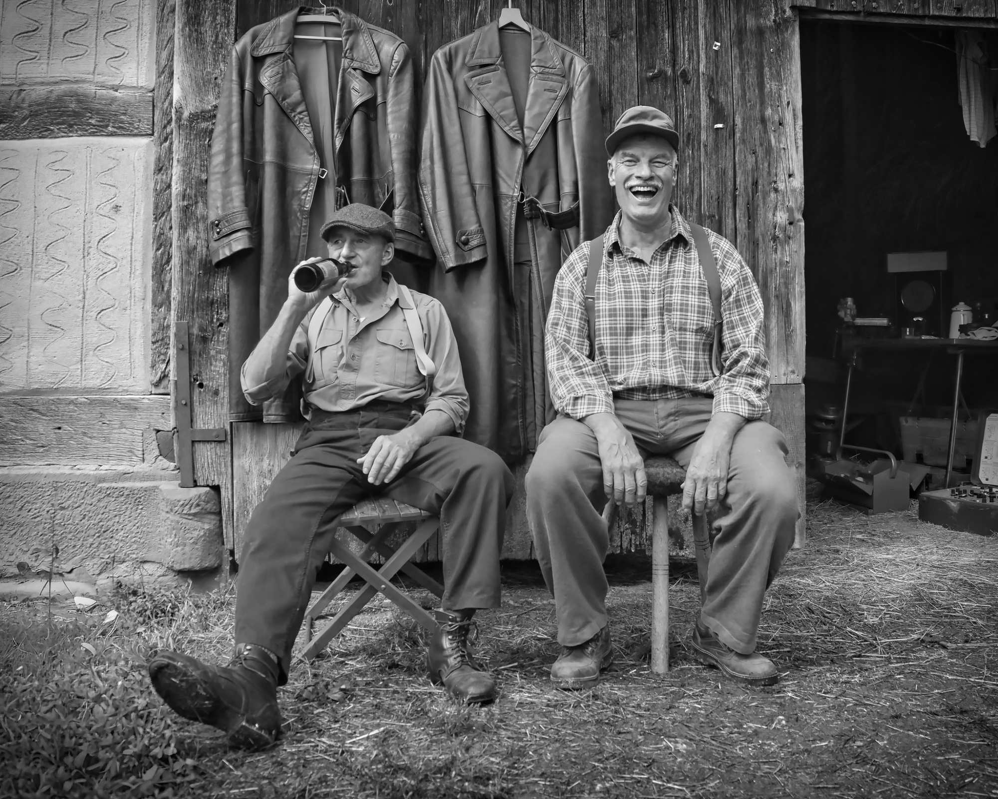 | Dorfpolizist Josef Wenzel Würkner mit Wilhelm Walter | Die Bonschabs mit Frau Anna Maria Eder auf der Hausbank |