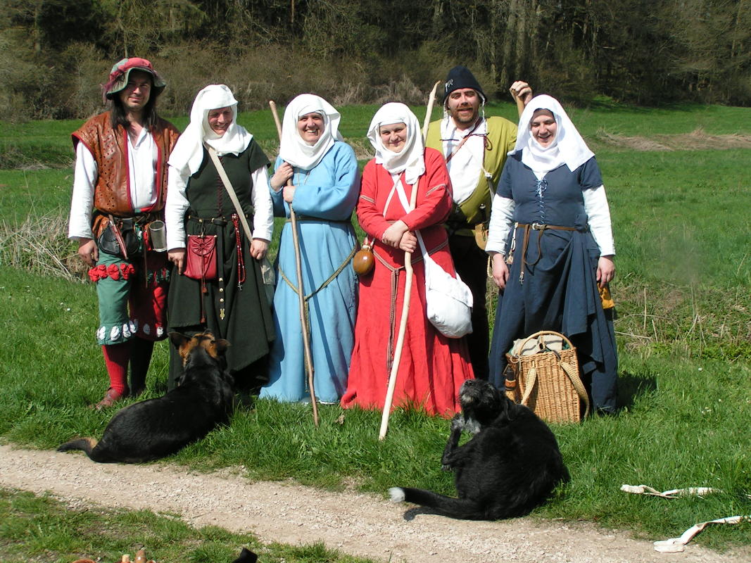 In diesem Jahr haben wir uns überlegt, nicht im Trachtenjanker bzw. Lodenmantel zu reiten, sondern - einer Wallfahrt angemessen - als spätmittelalterliche Pilger zu Pferd nach Kienberg hinüber zu reiten.