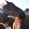 Wir heben den Tisch kurzerhand über den Zaun und lassen uns mit Kaffee und Nutellabrot im sonnigen Pferdeauslauf nieder. Sofort erregen wir die Aufmerksamkeit der Bewohner...