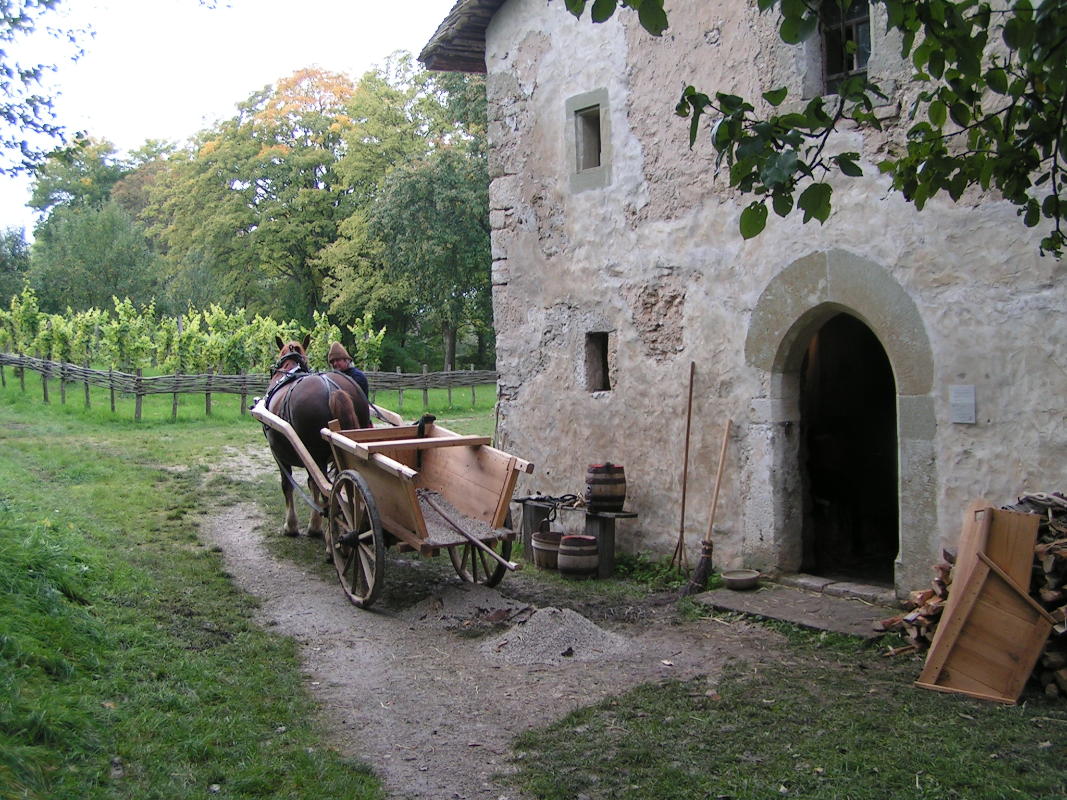 Küchenchefin Helga schickt uns aus, einen Korb voll Äpfel zu ernten und frisch für das Apfelmus zur Küche anzuliefern. Außerdem sollen wir gleich noch bei der Mühle Mehl und Gries laden, 3 frische Brote werden obendrein benötigt. Da ist Alberts Karren schon fast zu klein - vor allem in dem Jahr (2010), als Gilette und Fohlen Rufus hinten am Karren angebunden sind. Sie zeigen naturgemäß großes Interesse für die leckeren Äpfel oder Brot und na ja, das Heu würden sie schon auch nehmen...