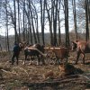 Vorbildlich steht Molly vor dem Karren, bis Bert das ganze Holz aufgeladen hat. Ab und zu zuckt mal ein Ohr nach hinten, wenn ein größerer Stamm in den Karren fällt und es hinter ihr poltert. Henrike hat Gilette losgebunden, damit Bert besser aufladen kann, Gilette steht Kopf an Kopf vorne bei Molly und beide sind wirklich sehr geduldig und brav.