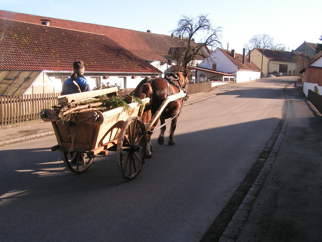Molly wird vor den Mittelalterkarren gespannt, Gilette kurzerhand hinten angebunden, so ziehen wir ins Holz, um die Aststücke nach Hause zu holen.