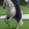 Und dann haben wir noch André Görlach mit seinem Lusitano Gladiador. Dieses Pferd beschreibt das Kriegs- und Turnierpferd des Mittelalters, den Destrier.