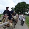 Ein beeindruckender bunter Lindwurm wälzt sich zum Klang von Trommeln, Hörnern oder Dudelsäcken am Museum beim Löwenhügel vorbei in Richtung Schlachtfeld. Rufus reiht sich hinter unserem Bataillon in den Zug ein. Unsere beiden Verwundeten Heinrich und Sebastian sitzen auf dem Karren, vorne auf dem Kutschbock nimmt noch Capitaine Brenneisen Platz, der sich ebenfalls am Knie verletzt hat und die weite Strecke nicht laufen kann. Für unseren Fuhrmann, der eigentlich selber fahren wollte, heißt das, dem Herrn Offizier seinen Platz überlassen und laufen. Es lebe das Reglement.