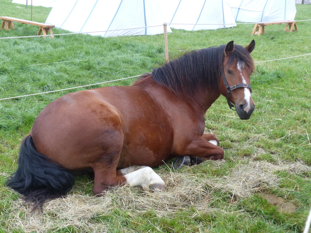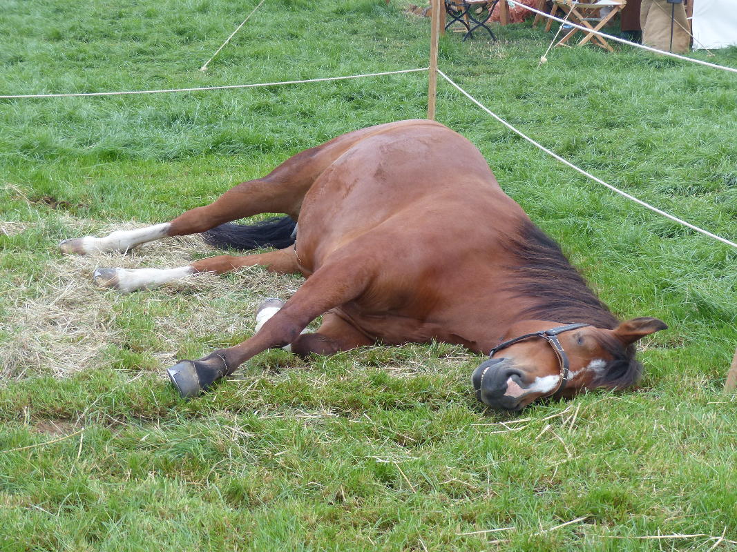 Als wir aufwachen, liegt Rufus immer noch entspannt im Paddock. Er hat einiges an Schlaf nachzuholen. In Ligny wollte er sich nicht so recht entspannen, da hat er sich nicht wohl gefühlt, weil ein Anwohner von seinem Gartenzaun aus das Lager die halbe Nacht lang still beobachtet hatte. Rufus hat dieses lauernde Gestalt offenbar als latente Bedrohung empfunden. Dann kam der dreitägige anstrengende Marsch, eine Nacht mit fremder Herde auf der Koppel, die zweite Nacht bei strömendem Regen. Hier in Hougoumont nun, inmitten all der lärmenden Menschen, fühlt er sich sicher und geborgen.