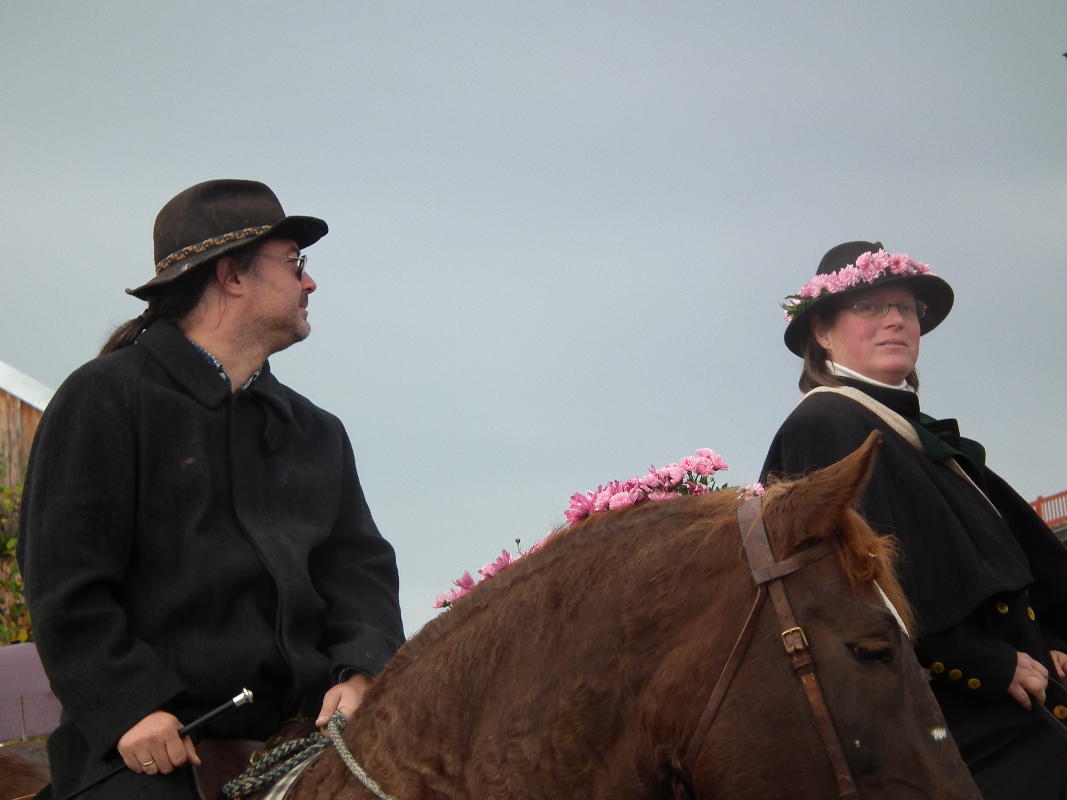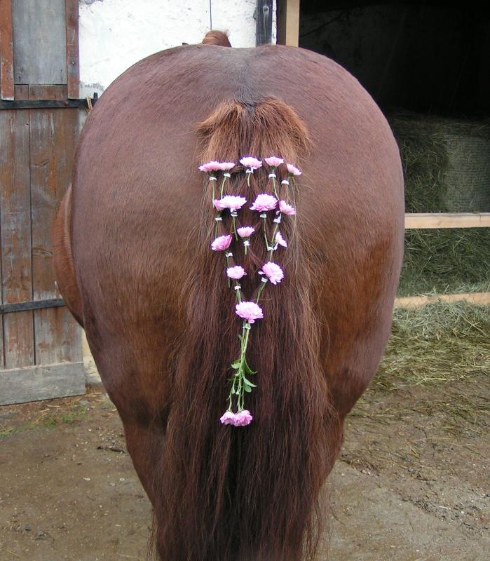 Diesmal hat es das Wetter leider nicht so gut mit uns gemeint, aber ein paar Regentropfen können uns nicht abhalten. Prächtig mit Chrysanthemensträußchen geschmückt holen sich Molly und Gilette ihren Segen ab. Ein paar Tropfen Weihwasser können nicht schaden - wirklich begehrt aber ist das geweihte Brot, das schmeckt ihnen immer!
