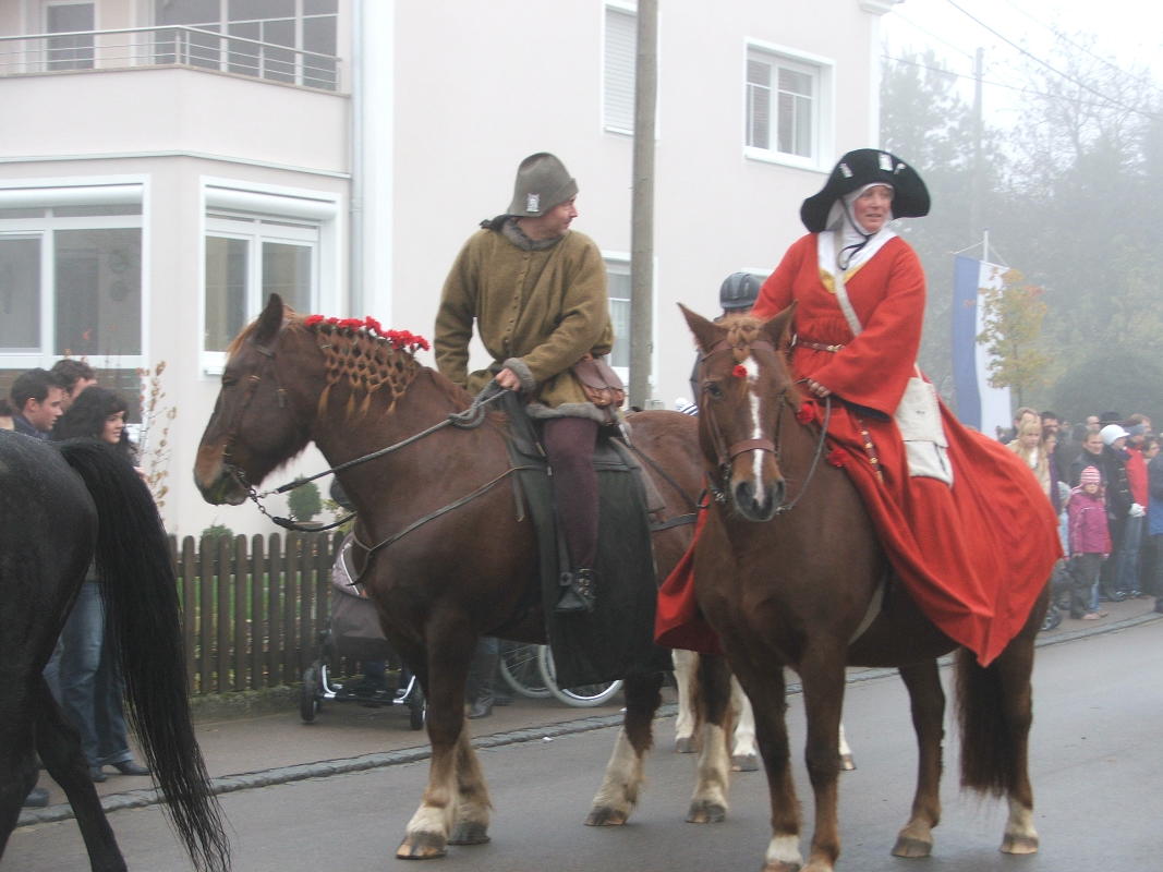 In diesem Jahr haben wir uns überlegt, nicht im Trachtenjanker bzw. Lodenmantel zu reiten, sondern - einer Wallfahrt angemessen - als spätmittelalterliche Pilger zu Pferd nach Kienberg hinüber zu reiten.