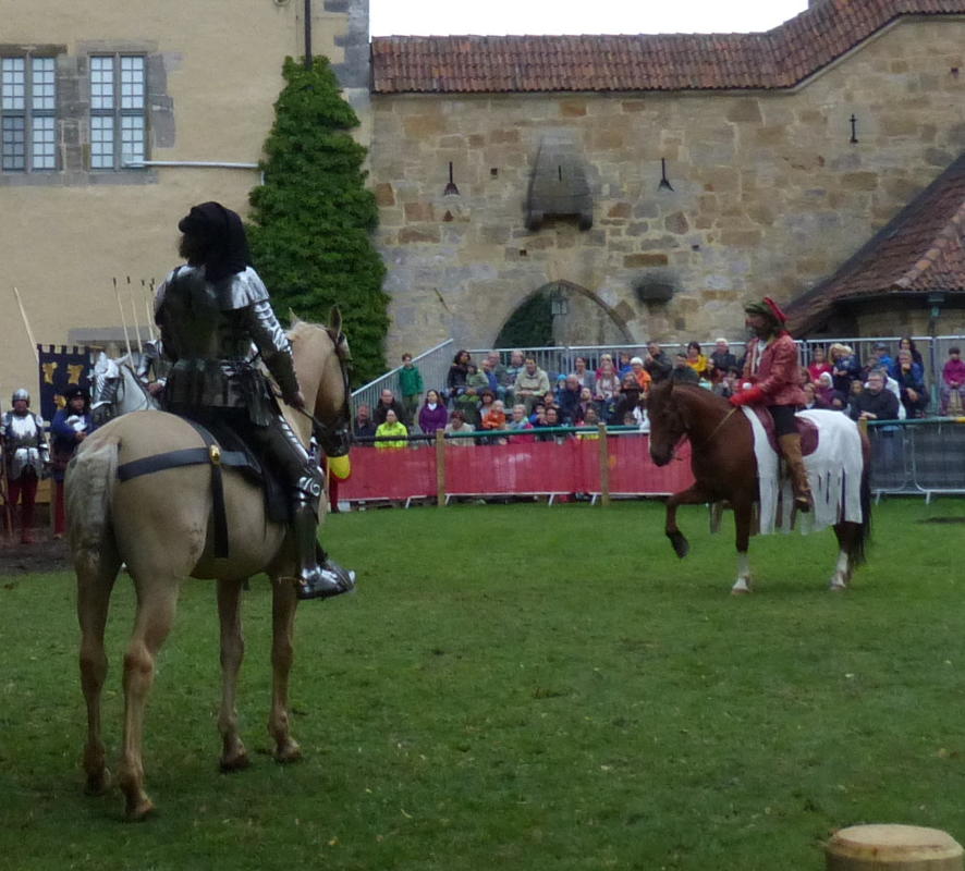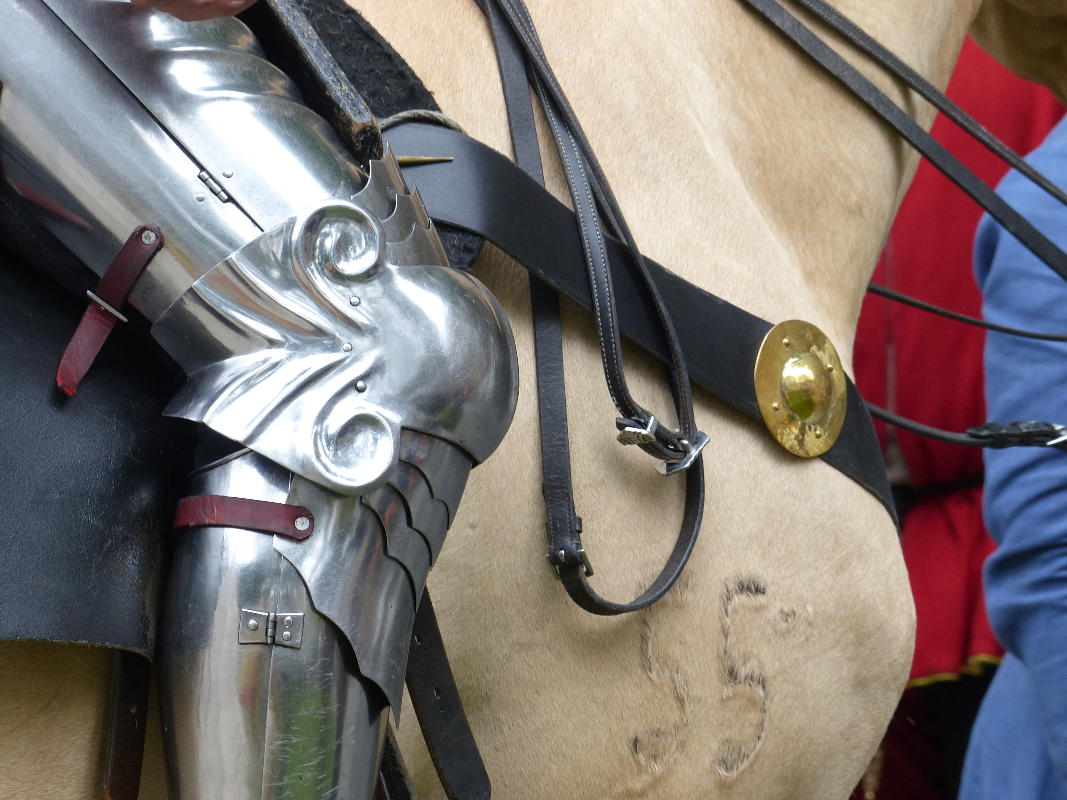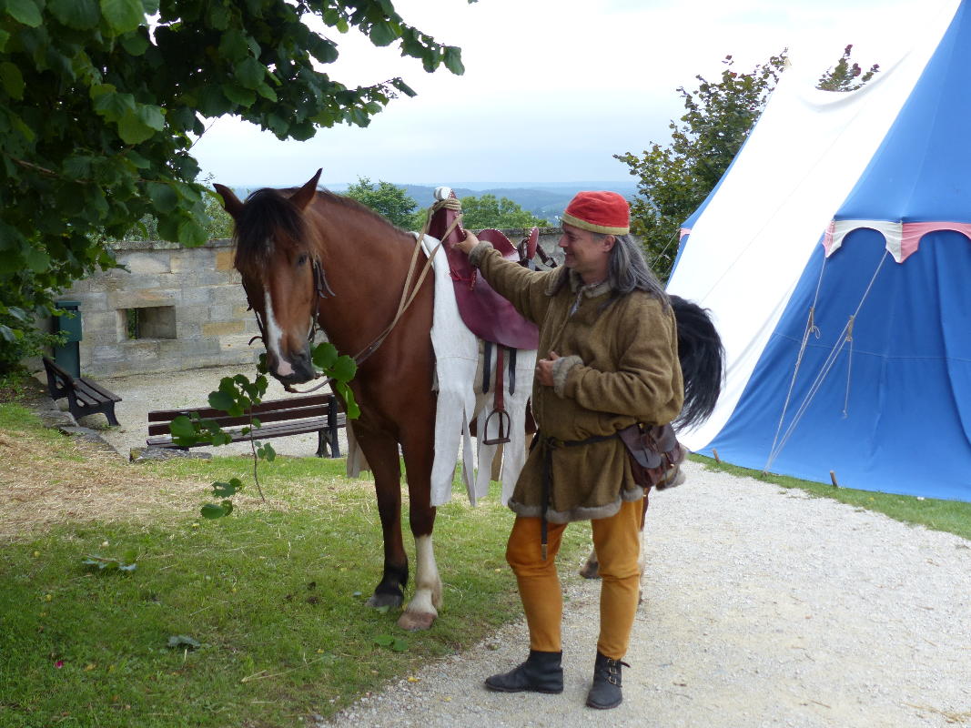Am nächsten Tag bieten wir dem Marschall Rufus an als nervenstarkes mobiles Rednerpult. Wir sind total stolz, als er das Angebot annimmt. Da kommt es sehr gelegen, daß wir den von Joram van Essen gefertigten Spätmittelalter-Sattel und die Zaddeldecke dabei haben.