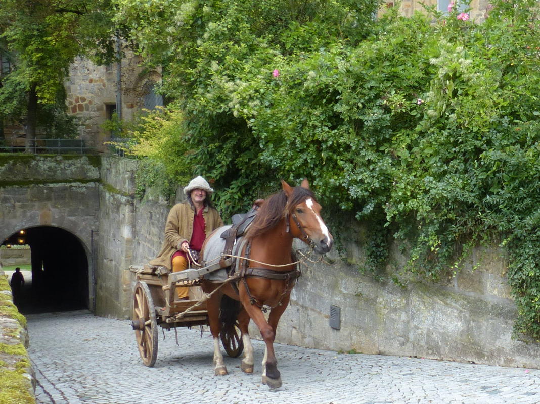 Unser Karrengaul Rufus wird zunächst einmal eingesetzt, um Brennholz und Wasser für die diversen Lager zu transportieren. Natürlich fahren wir auch wieder einfach mit unserem Karren spazieren.