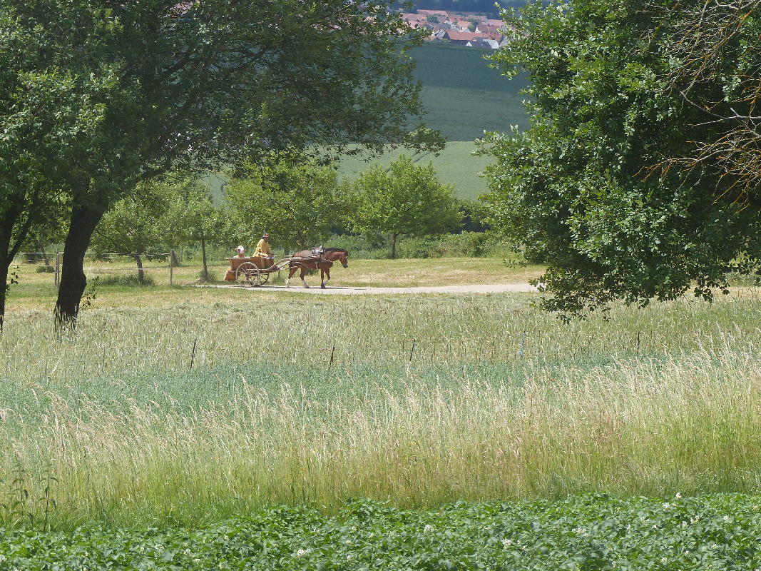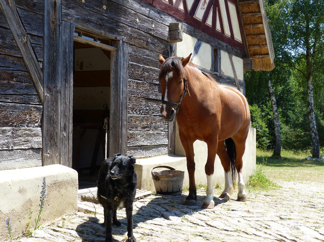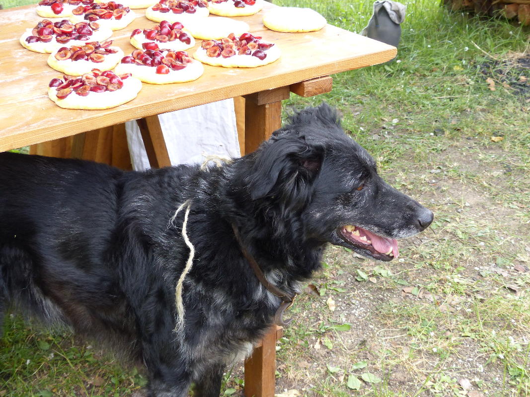 Am Samstag ist ein großes gemeinsames Festmahl vorgesehen. Der DeLorean transportiert Tisch, Bänke, Pasteten, Braten und jede Menge weitere leckere Speisen ins 1800er-Dorf. Wir sitzen gemütlich zusammen, Rufus wird ausgeschirrt und läuft im Innenhof des Bauerngehöfts frei herum, alles ist völlig entspannt - bis Rufus die Lavendelseife entdeckt...