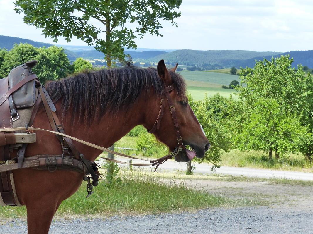 Rufus fühlt sich sehr wohl in Perschen. Sofern er nicht im Dienst ist und vor seinem Wagen eingespannt, darf er um den Paulerverl-Hof herum völlig frei umherlaufen. Neugierig wie er ist, hat er seinen Schnuff überall dran...