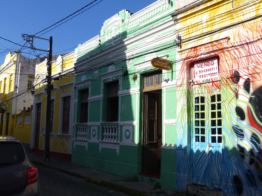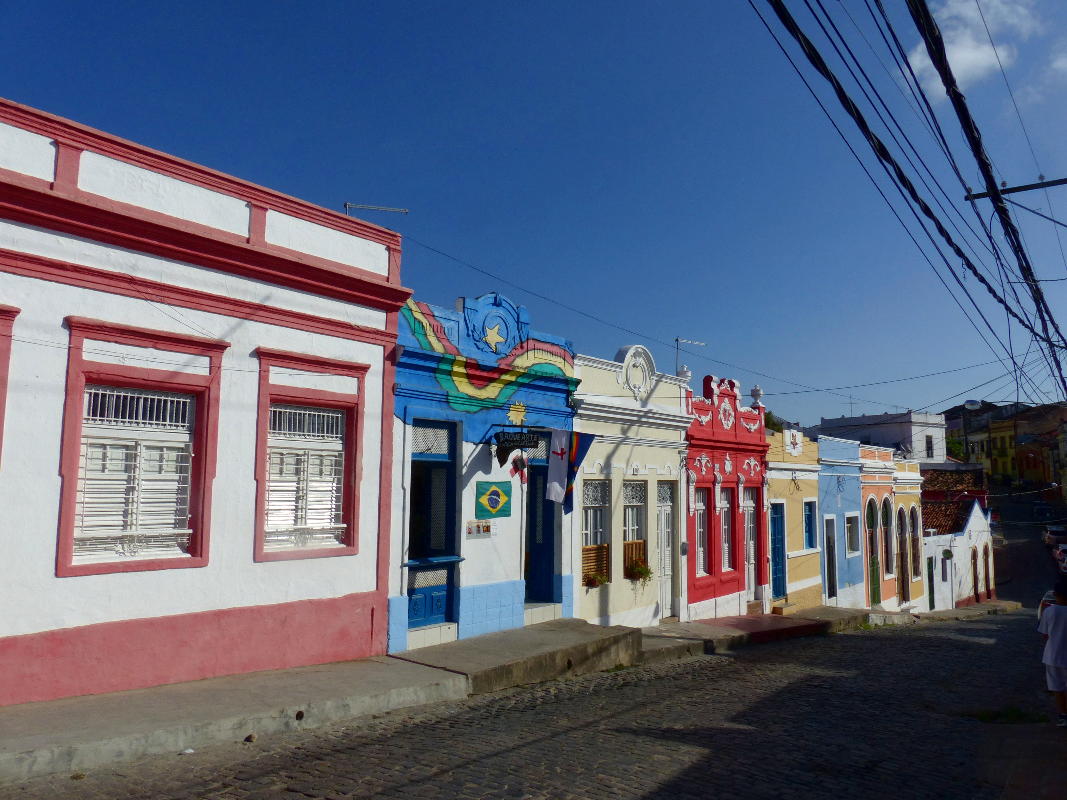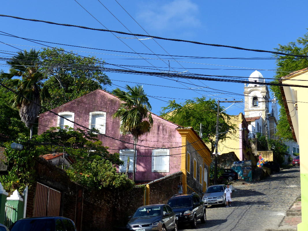 Das Stadtgebiet von Olinda ist sehr hügelig. Vom Meeresrand führen steile, Kopfstein-gepflasterte "Ladeiras" hinauf zur oberen Stadt. Zu unserer Bequemlichkeit nehmen wir den "Hop-on-hop-off"-Service der Stadtverwaltung in Anspruch, die Fahrzeuge auf einer festgelegte Route einsetzt, in die man bei einmal entrichtetem Fahrpreis jederzeit ein- und aussteigen kann.