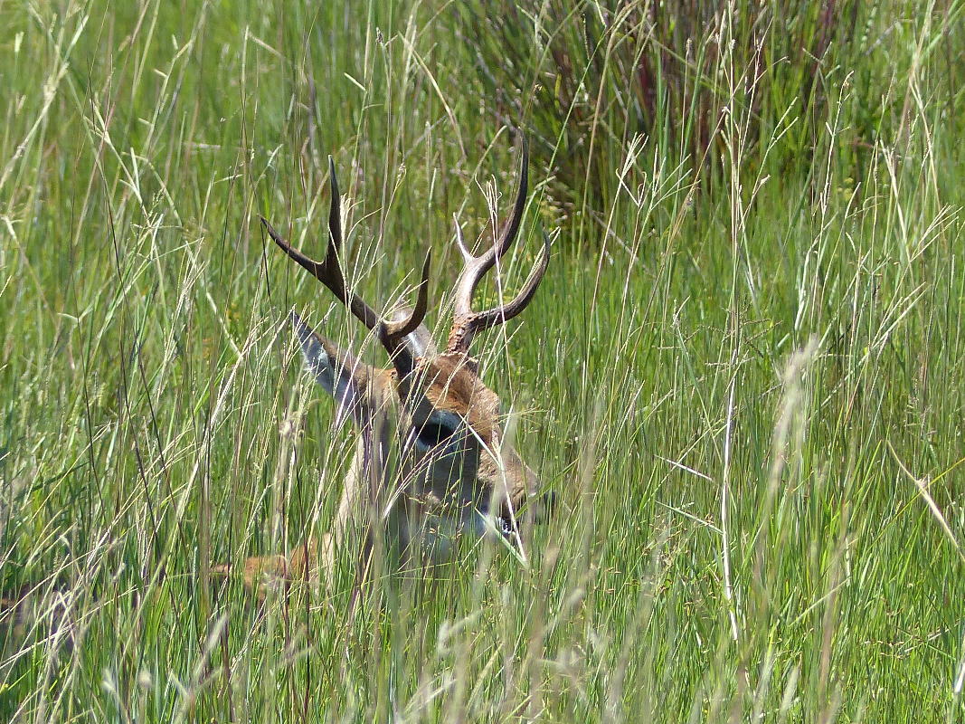 Am späten Nachmittag sind wir wieder mit unserem Traktor nebst Anhänger unterwegs. Hier sichten wir unseren einzigen Sumpfhirsch.