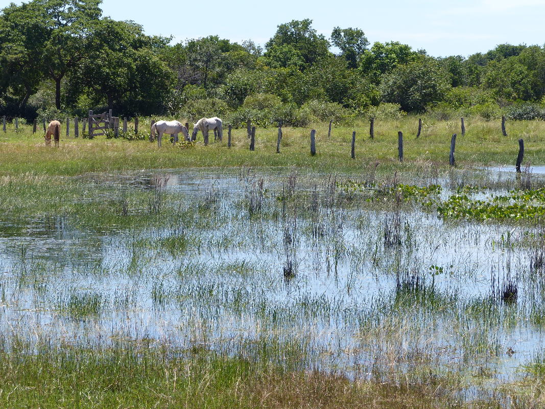 Die Pferde der Fazenda gehören der Rasse "Cavalo Pantaneiro" an. Diese Pferderasse geht ursprünglich auf die argentinischen Criollos zurück, hat sich im Pantanal aber seit etwa 200 Jahren eigenständig weiterentwickelt. Die Pantaneiros sind klein - das durchschnittliche Stockmaß liegt bei 142 cm - aber unglaublich zäh und robust, einfach in der Handhabung, mit weichen Gängen ausgestattet und außerdem gut angepaßt an ihren Lebensraum mit Hitze, viel Feuchtigkeit und ständig nassen Hufen. Wir haben auf unseren Ausflügen Pferde gesichtet, die unverdrossen bis zum Bauch im Wasser standen und Grashalme gezupft haben. Vicente Coelho Lima Jurgielewicz, der Sohn von Dona Rita und Sr. Carlos, ist sehr engagiert für diese Pferderasse. Er ist Tierarzt und führt das Zuchtbuch des erst vor wenigen Jahren gegründeten Zuchtverbands.