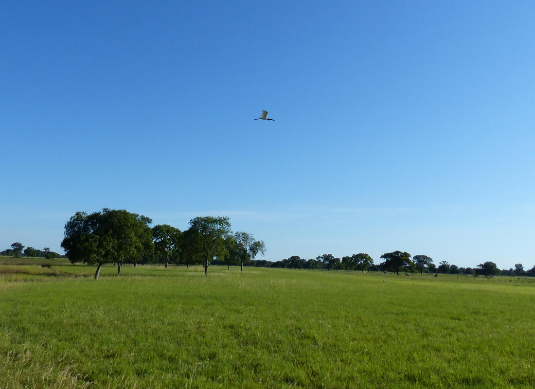 Die Wege sind teilweise schon so stark überschwemmt, daß wir nasse Füße bekommen. Andere, etwas höher gelegene Teile, bleiben savannenartig trocken. Wir sehen einen jungen Jabiru-Storch im Nest - hier im südlichen Pantanal nennt man den Vogel Tuiuiú.