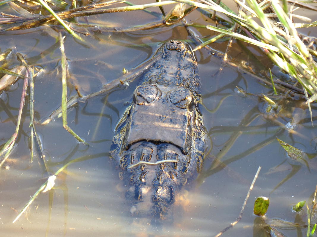 An einem ausgedehnten Wasserloch beobachten wir Reiher, Störche, Capivaras und Brillenkaimane (Jacaré) einträchtig vereint. Keiner scheint sich an der Anwesenheit des anderen zu stören.