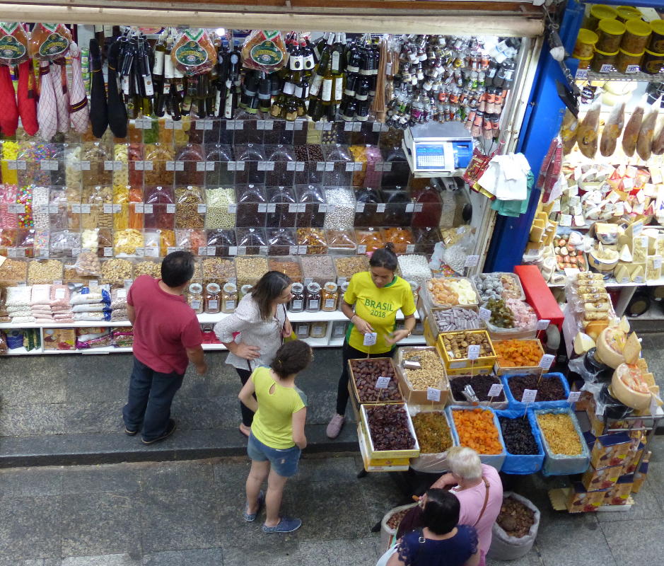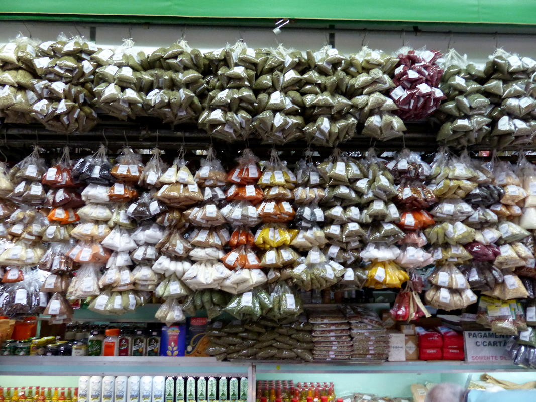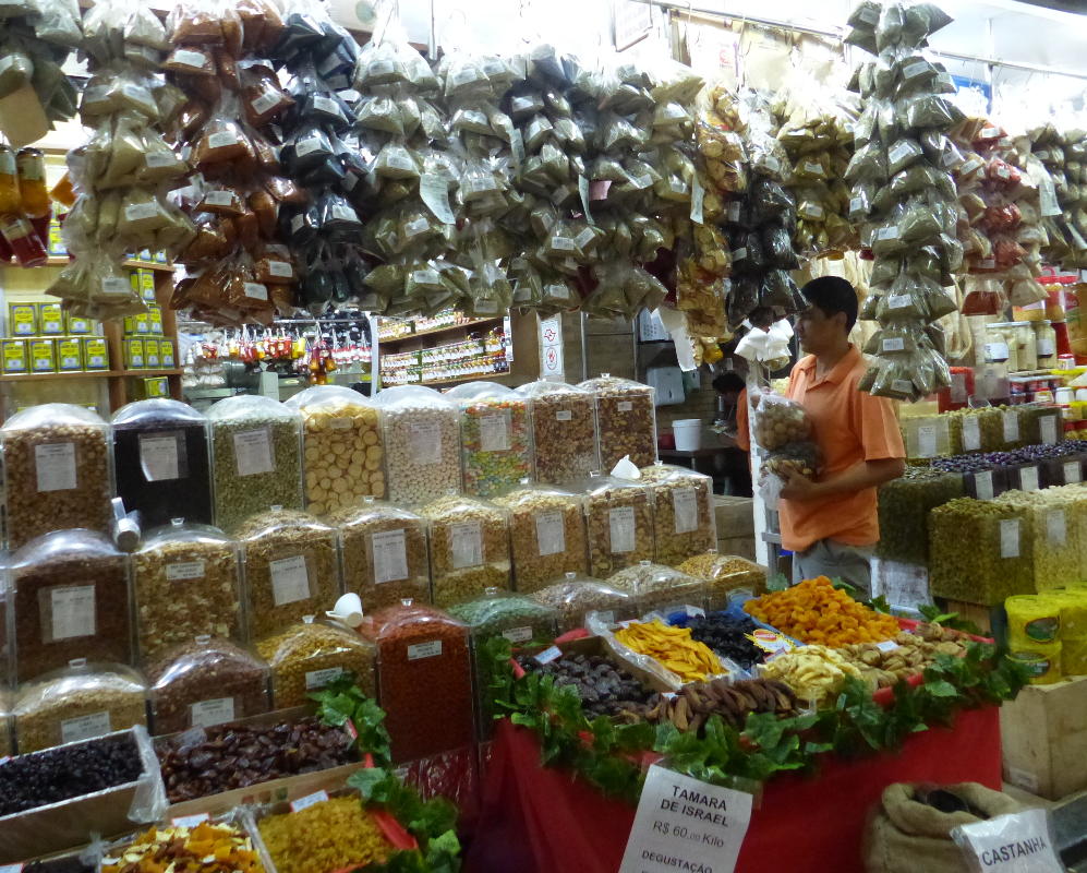 Am Dienstag unternehmen wir einen Ausflug in die Innenstadt von São Paulo. Mit dem Taxi fahren wir von Embu zur Markthalle, dem Mercado Municipal de São Paulo, von den Paulistas liebevoll "Mercadão" genannt. Im Jahr 1933 fertiggestellt, beherbergt das Untergeschoß Dutzende Marktstände, während die Galerien mit Restaurants bestückt sind.