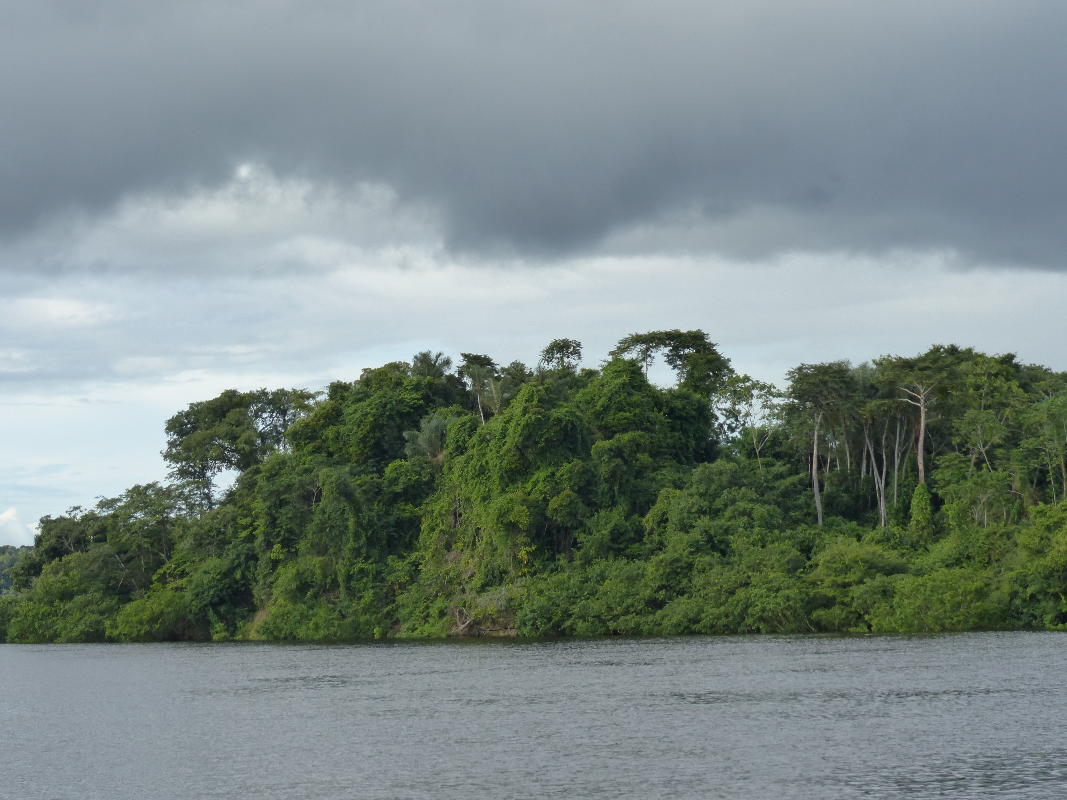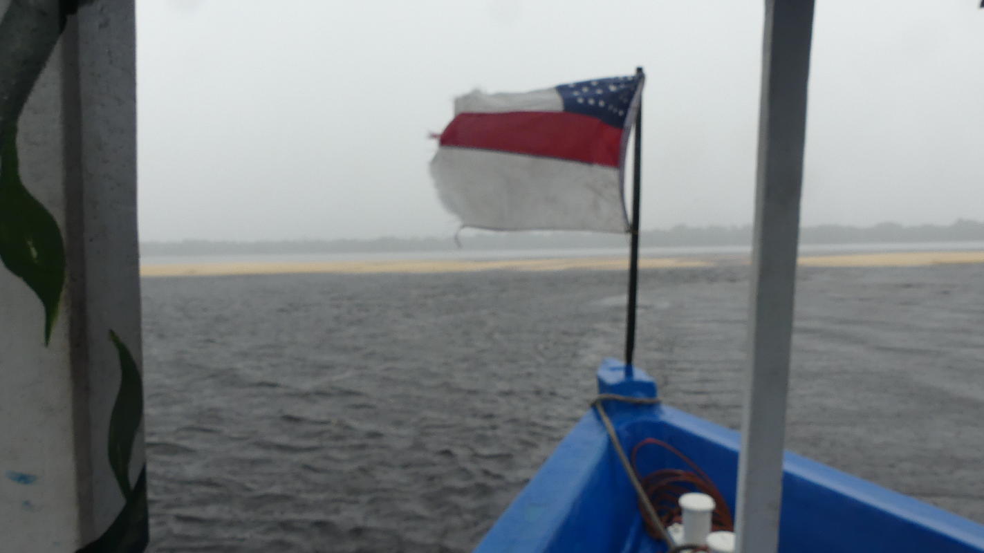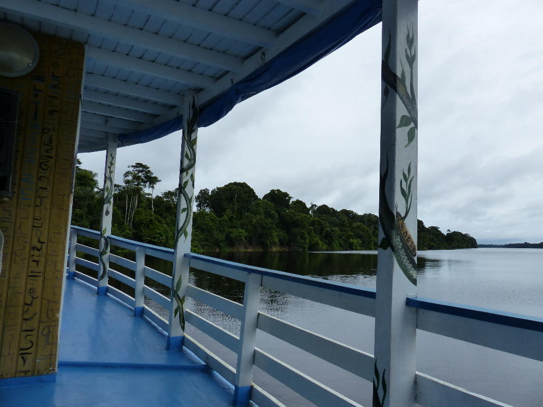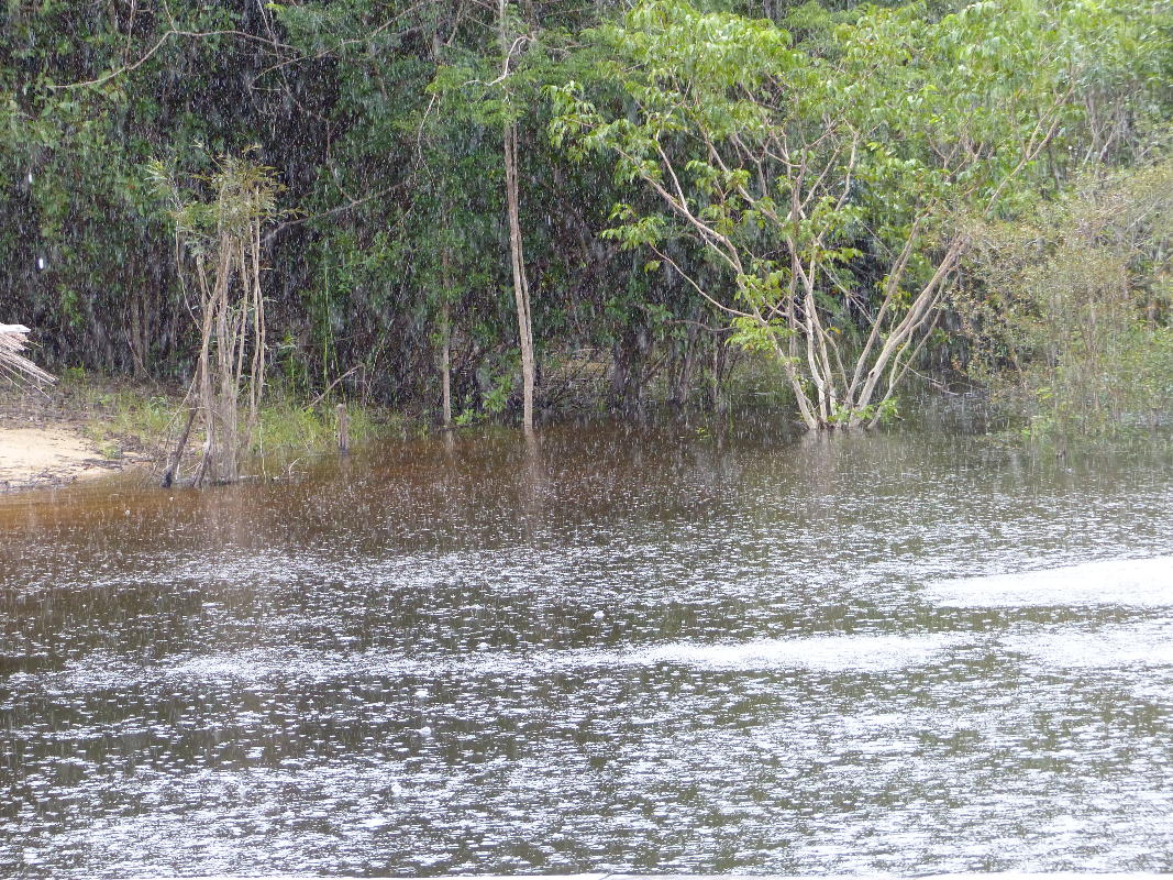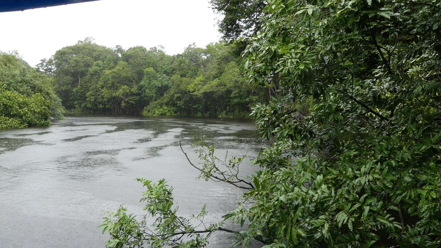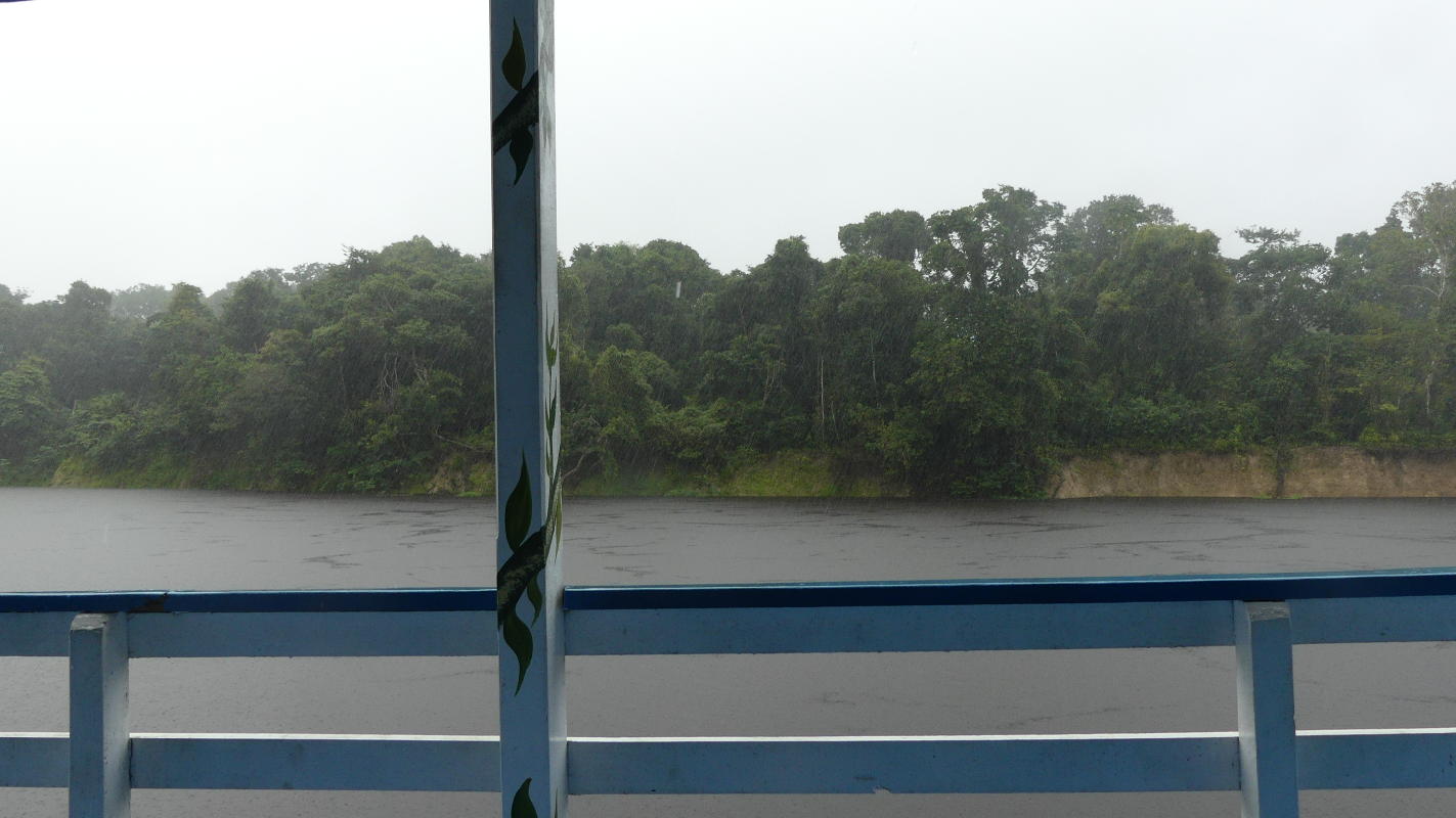 Noch einmal fahren wir durch einen engen Anavilhanas-Kanal, bei dem man das Gefühl hat, die Pflanzen vom Schiff aus berühren zu können. Nun setzt wieder Regen ein, als wir den Hafen von Novo Airão ansteuern.