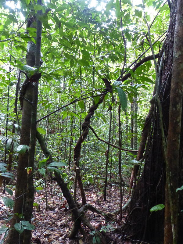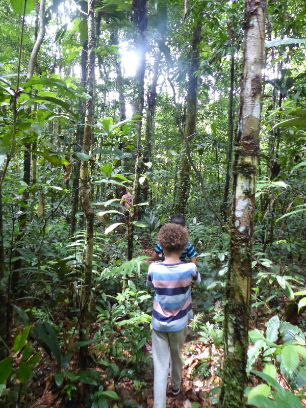 Nach dem Mittagessen setzen wir mit dem Beiboot über ans gegenüberliegende Ufer und gehen an Land. Wolfgang führt uns auf einem Trail durch den Urwald. Wir sehen wilde Strelitzien, jede Menge Lianen und riesige Bäume mit Brettwurzeln (Samauma).