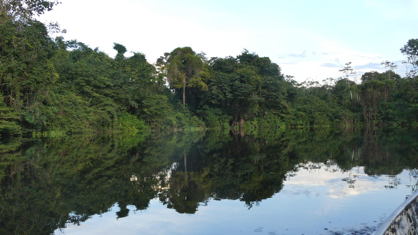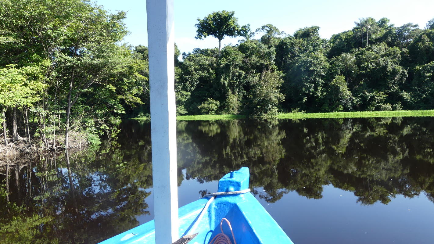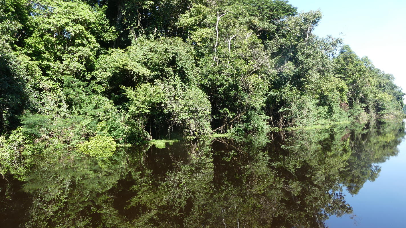 Arnaldo fährt mit uns extra noch in einen weiteren Seitenarm hinein, damit wir dieses wunderbare Naturschauspiel der überfluteten Waldlandschaft geniessen können. Ich verstumme in Ehrfurcht vor dem grandiosen Anblick der perfekten Spiegelung der Bäume im absolut glatten dunklen Wasser.